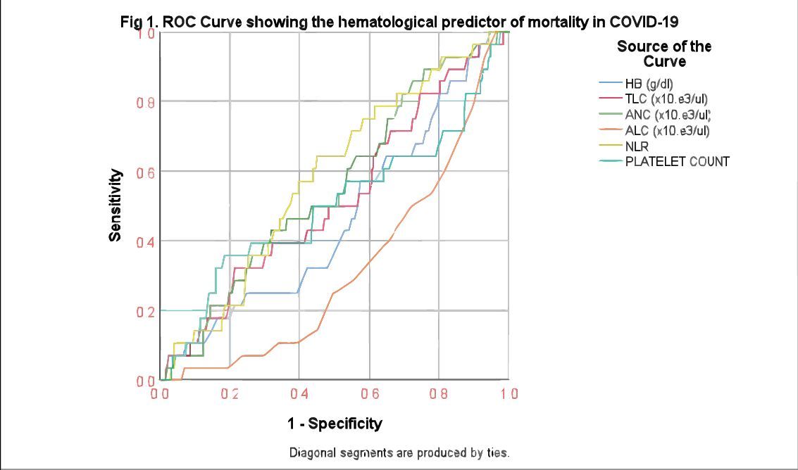 Considering the higher rate of infectivity and mortality due to COVID-19, an early detection of the disease and understanding the prognostic values of the simple tests that are available even at primary and secondary care centers, is the need of time. In present study we noted that the clinical sensitivity of NLR was 93.1% with Area Under curve on ROC of 0.68. This documents it to be a major prognostic factor in COVID-19 to predict mortality/worst outcome with a followed by absolute neutrophilic count (ANC). A higher TLC, ANC and NLR carry bad prognosis in case of COVID-19. No doubt the definite diagnosis of the COVID-19 is by RT-PCR. Asymptomatic /subclinical patients deteriorate if not properly observed and looked after7. We analyzed the role of complete blood count (CBC) and assessed various hematological parameters for their prognostic values in groups with survivors against those met the unfortunate end of lives with COVID-19. We observed that no significant difference in concentration of hemoglobin in both the groups with different outcome (p>0.05). However there was a significant difference in indicators i.e. TLC, ANC, ALC, NLR and Platelet counts among the survivors versus non survivors (p<0.05). Similar findings have been reported from a study conducted in Ankara Turkey [9]. Another study from Karachi Pakistan reported 364 Covid-19 patients, with 27.7% mortality. They assessed likewise patients in survivors and non-survivor groups. They reported that there was a significant difference in TLC (p<0.001), ANC (p<0.001) and ALC (p<0.001) [10]. Their findings were in concordance with our results.