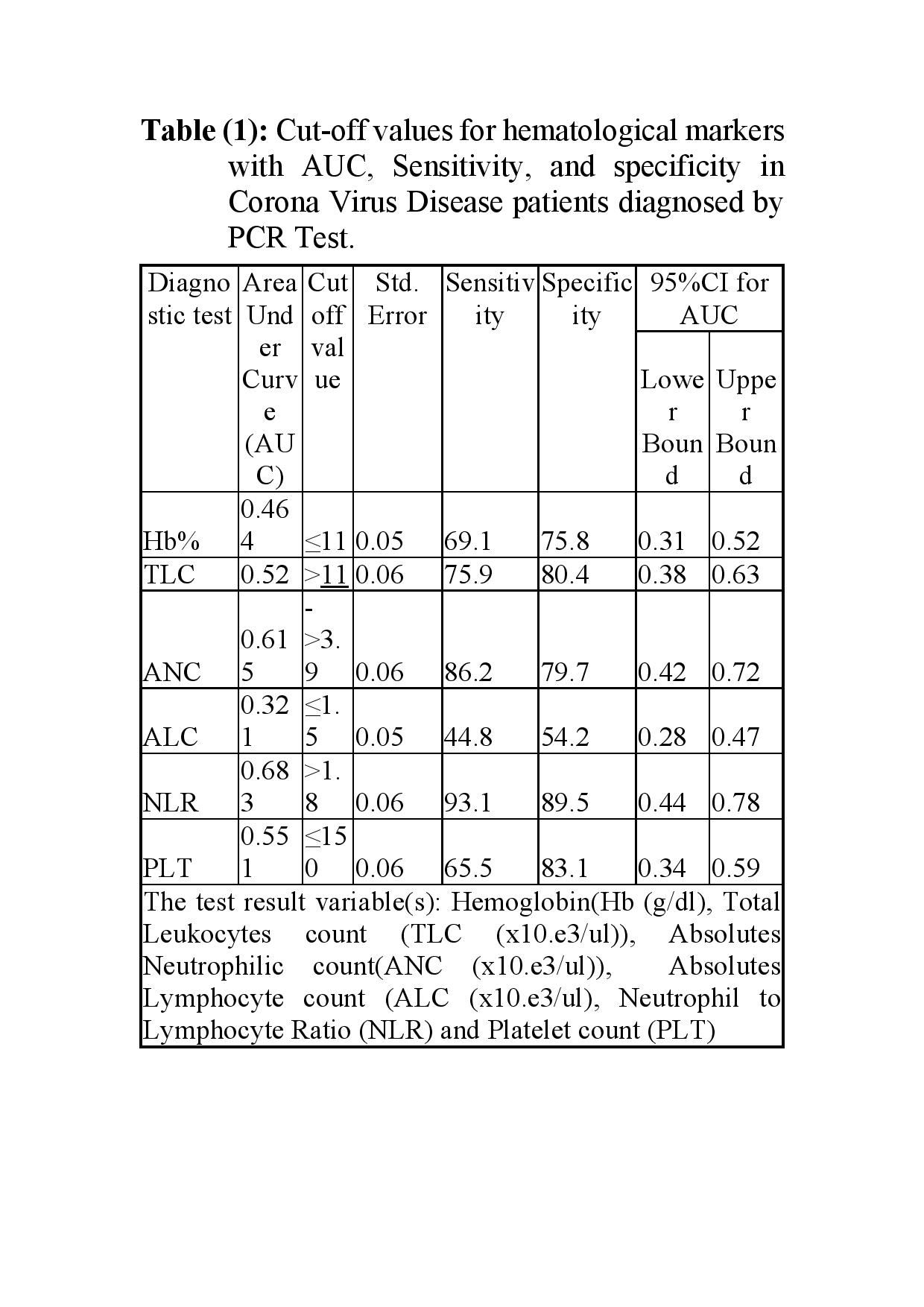 Receiver operating characteristics (ROC) curve was used for estimation of the area under curve (AUC) to determine the relationship of clinical sensitivity of different hematological indicators and to predict the worst outcome in COVID-19. The sensitivity and specificity were calculated using diagnostic statistics with ROC curve and 95% confidence interval. (Table 1, figure 1).