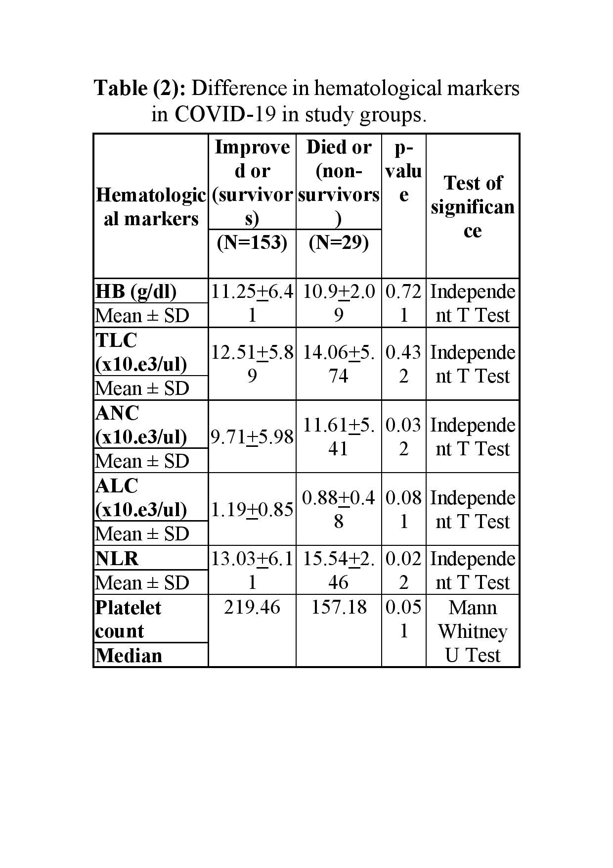 The reports of CBC of 182 cases admitted in the COVID-19 isolation unit in two tertiary care hospital of Khyber Pukhtunkhwa (Qazi Hussain Ahmed Medical Complex Nowshera & Hayatabad Medical Complex Peshawar) were analyzed from 1st May 2020 to 30th Aug 2020.