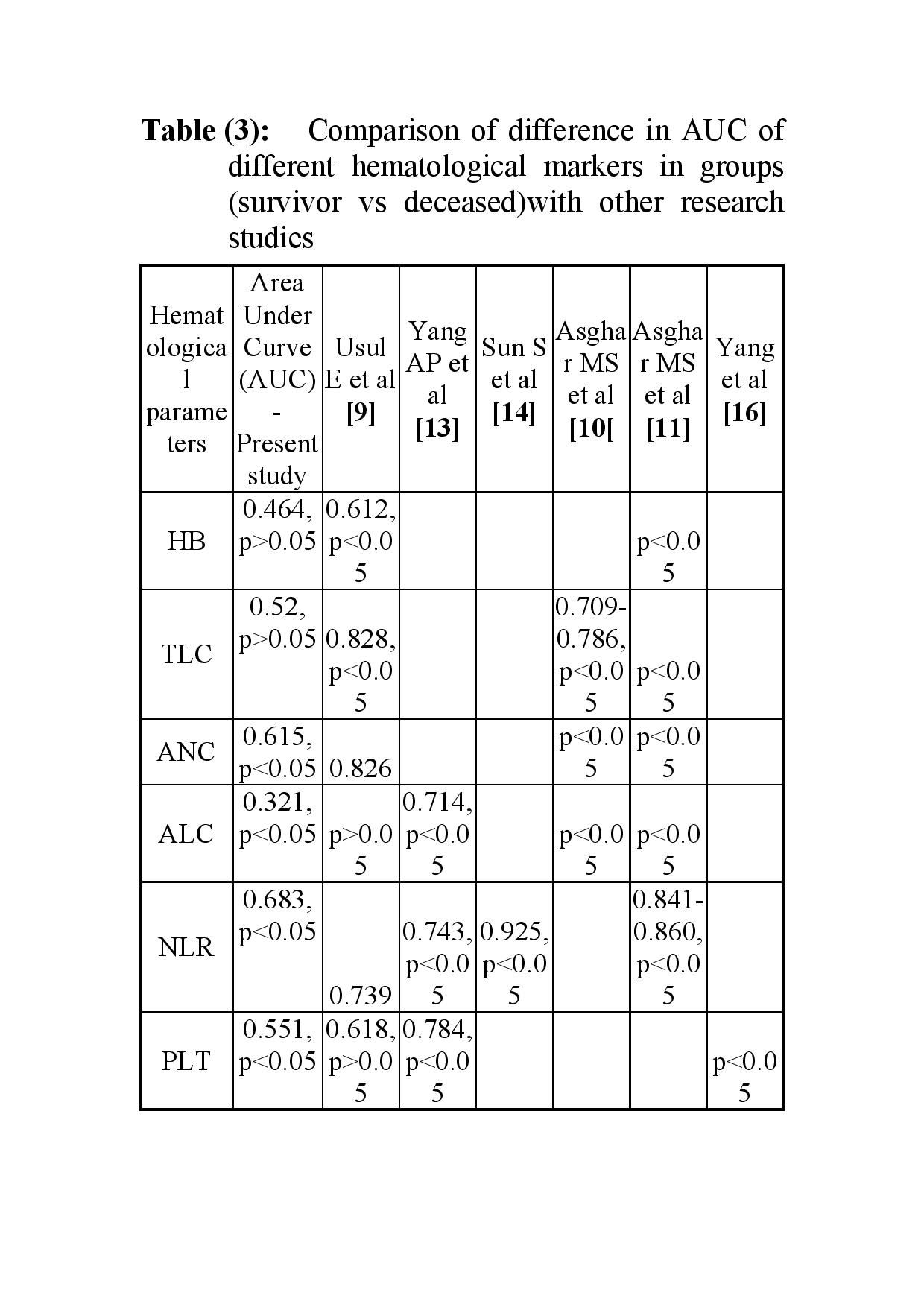 Another retrospective study by the same principal author, from different teaching hospitals of Karachi, reported a significant difference of hematological markers in groups survived versus expired. They reported a significant difference in mean Hb% (p-0.03), TLC, ANC, ALC and NLR (p-0.001 each) [11]. Again their findings do match our results for WBC and platelet but we could not find a significant difference in mean Hb% of the survivors versus deceased.