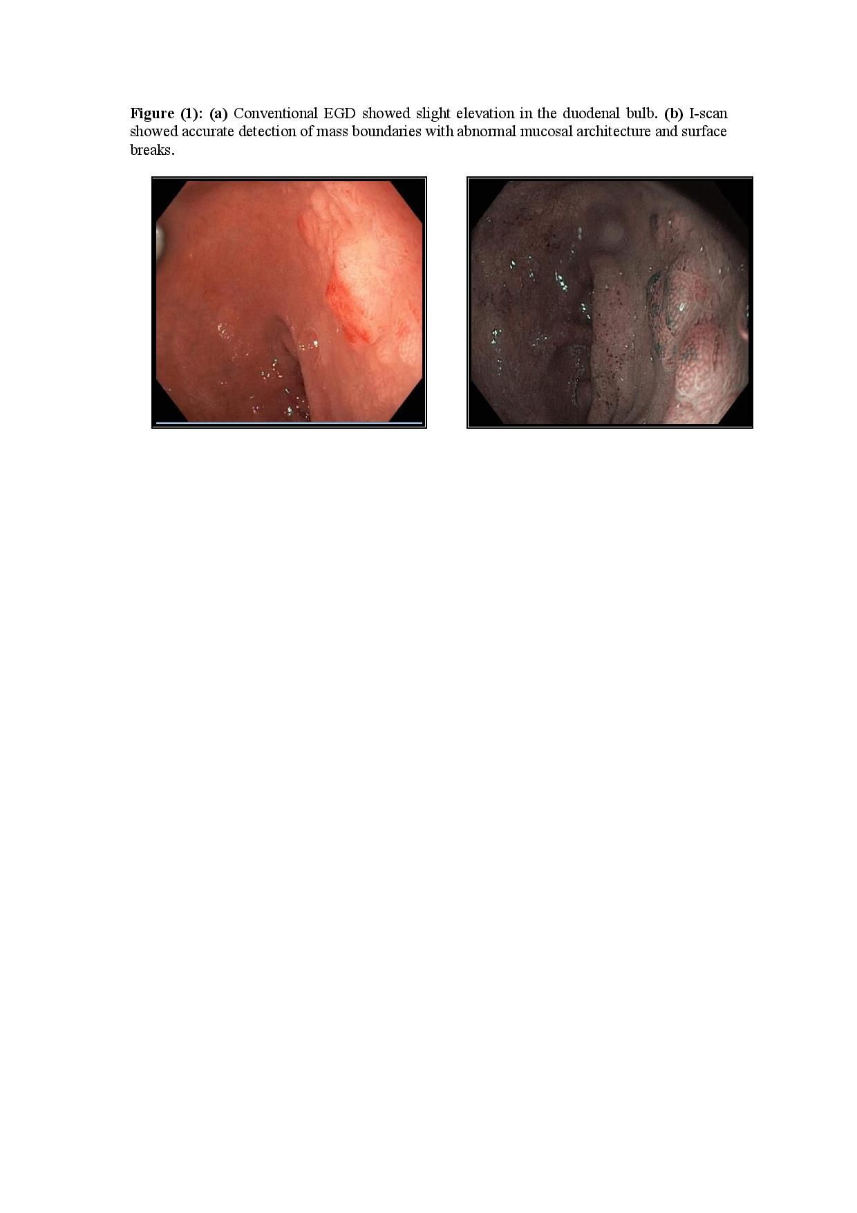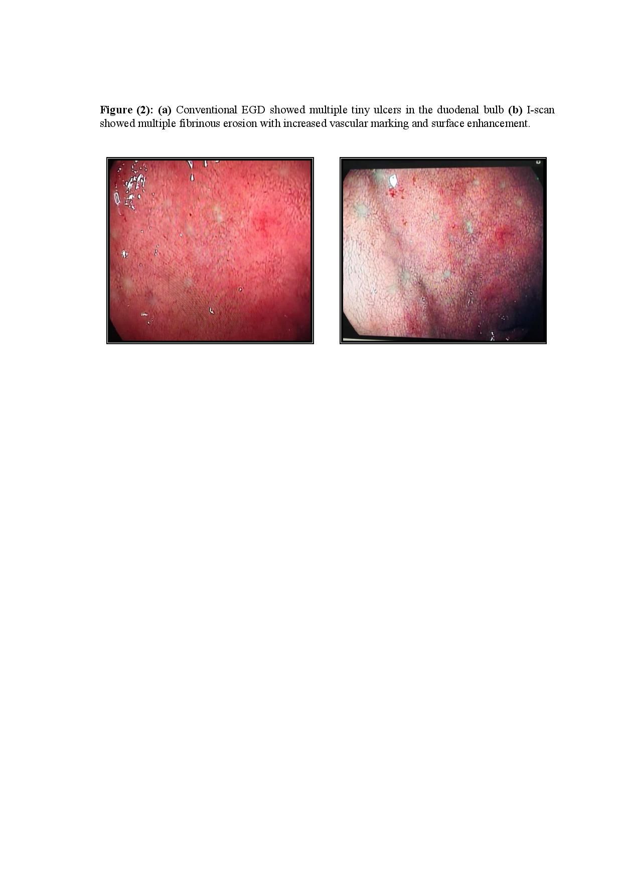 Mucosal duodenal lesions in our study patients by I scan viewed as table (3) 48.8% of the studied patients were normal, 9.7% were PVA, 2.4% were polyps, 4.8% were Ulcers, 14.6% were Nodules, 14.6% were fibrous erosion and 4.8% were abnormal sub mucosal lesions (Accentuated elevation with prominent mucosal architecture with distant mucosal abnormalities), while vascular changes viewed as increased with surface enhancement in 63.4% of cases fig (1, 2).