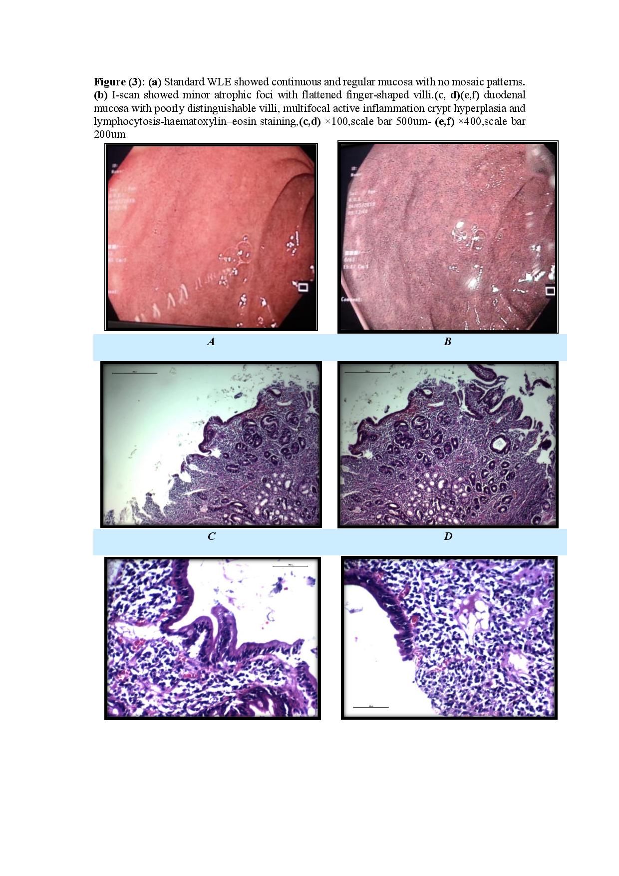 All patients were subjected to complete history taking and clinical examination. We stressed on the possible causes of weight loss, dyspepsia, abdominal cramps and chronic diarrhea. We examined the abdomen for epigastric tenderness, organomegally and palpable mass. Laboratory investigations were assessed as complete blood picture, liver function test: alanine amino transferase (ALT), aspartate aminotransferase (AST), serum albumin, total and direct bilirubin by routine enzymatic methods (spinreact), Anti-tissue transglutaminase (Anti TG-Ig A) and endomysial antibodies (EMA). Pelvi-abdominal Ultrasound was done to detect organomegally, abdominal mass, and exclude chronic liver disease [13]. Upper GIT endoscopy was done using Pentax video endoscopy unit in association with I-Scan techenology imaging with high resolution view. 4 to 6 guided biopsies by I-Scan were taken from the duodenum (in duodenal folding or interfolding) at potential atrophy sites and when disorder was suspected, which were histopathologically examined.