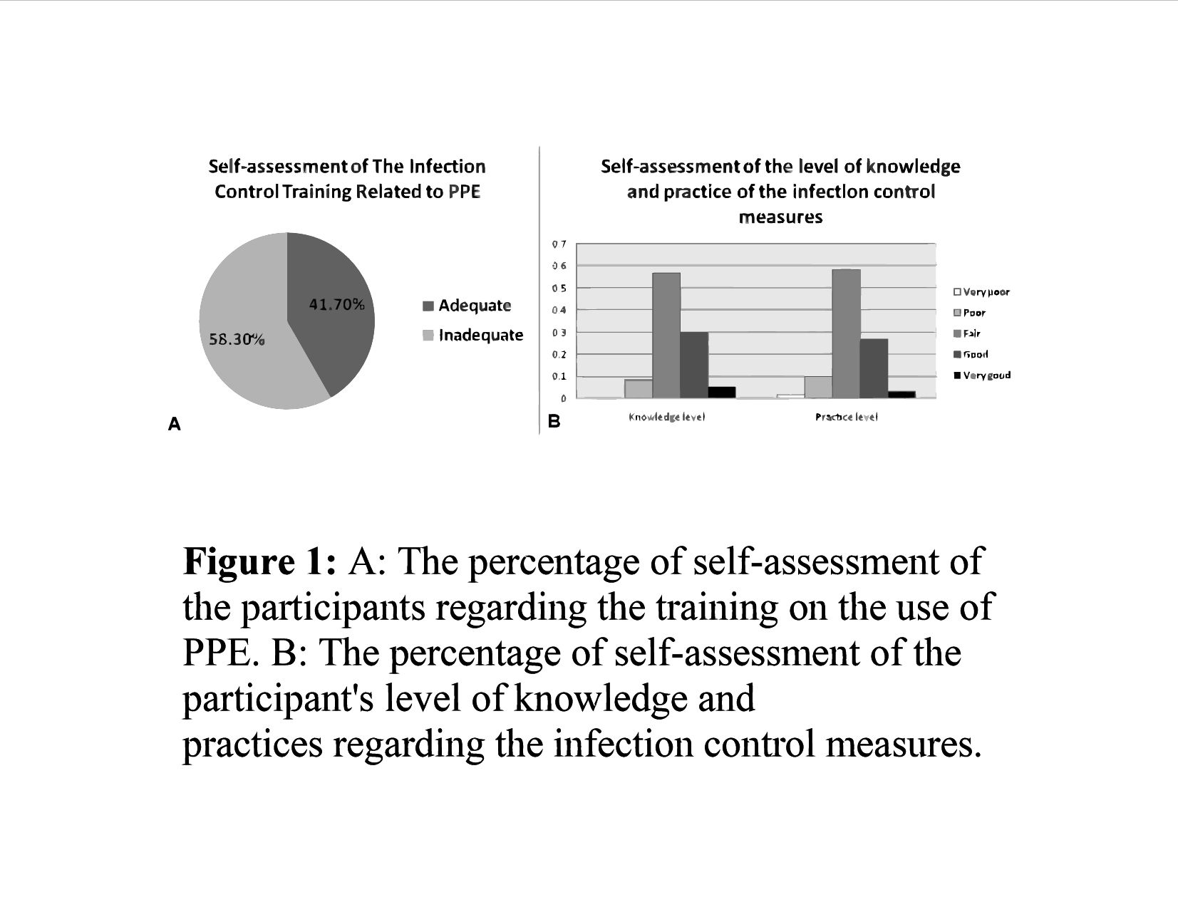 When asking a question on self-assessment of the participant's level of knowledge and practices regarding the infection control measures graded from very poor, poor, fair, good and very good; 56.7% and 58.3% found it to be fair, respectively (fig. 1B).