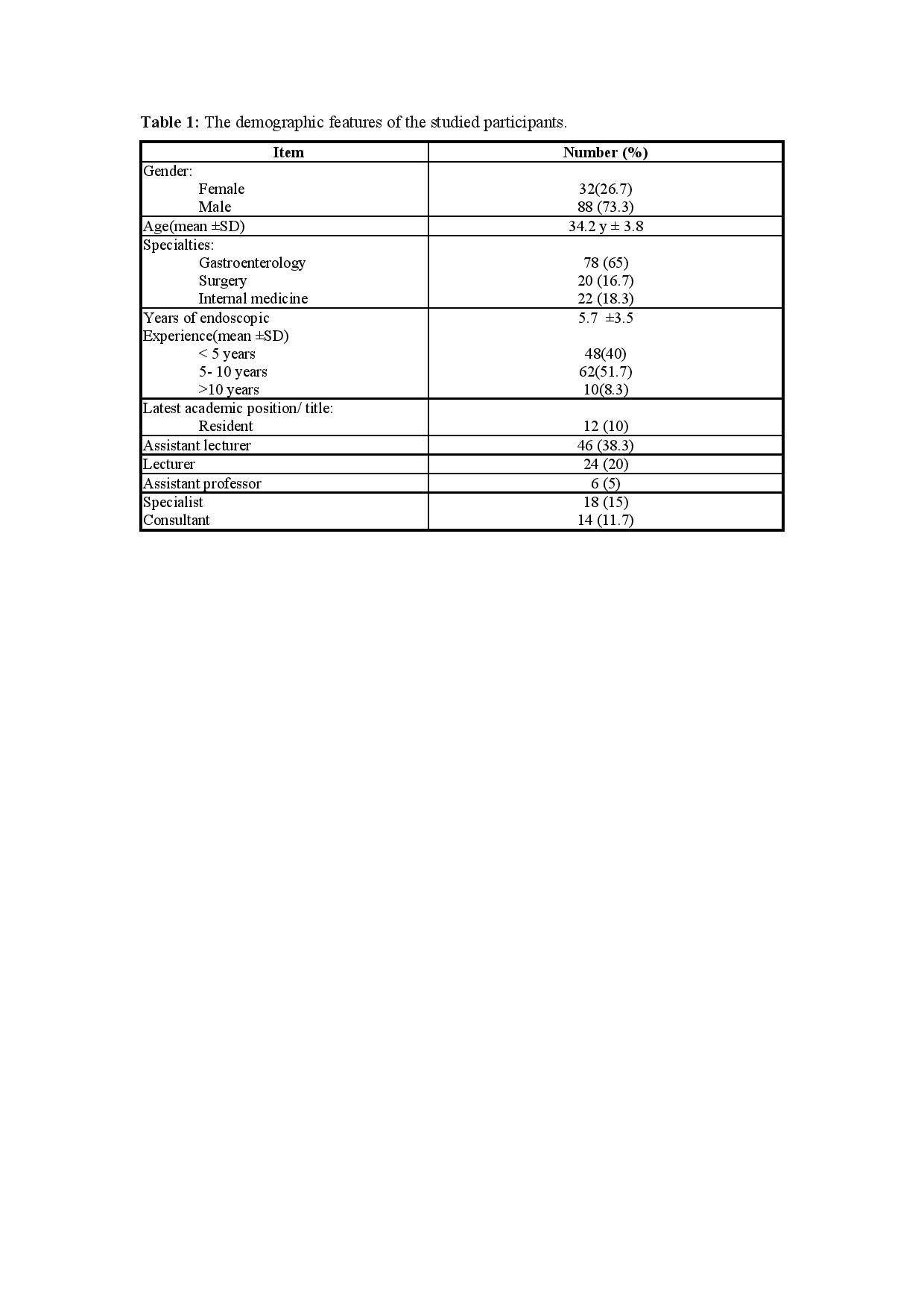 In this study a total of 120 participants responded to the questionnaire. As shown in table 1, the demographic features of the participants revealed that there were 88 males (73.3%) and 32 females (26.7%). Their mean age was 34.2 ± 3.8 years. About two third were gastroenterologists and about half had endoscopic experience between 5 and 10 years (51.7%).