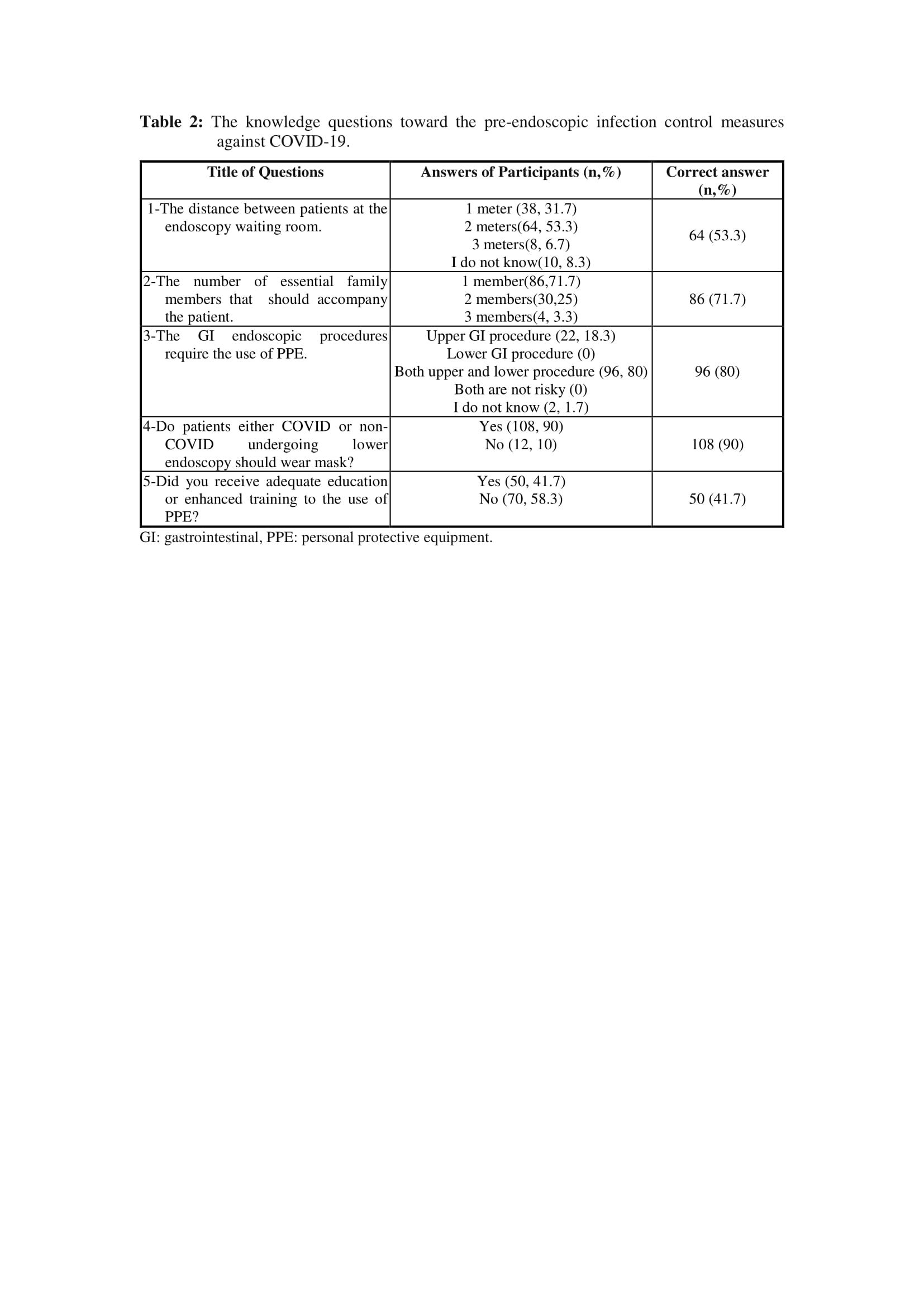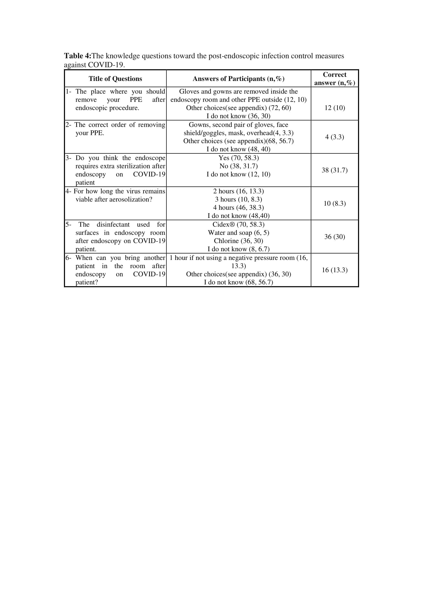 About one third of the participants (30%) did not know where they should take off their PPE after performing the endoscopy while 10% answered correctly. Moreover, 40% did not know the correct order of removing their PPE and only 3.3% selected the correct order. More than half (58.3%) thought that the endoscopy requires extra-sterilization after endoscopy on a COVID-19 patient. Forty percent did not know for how long the virus remains viable after aerosolization while 8.3% selected the correct answer of 3 hours. More than half (58.3%) considered that Cidex® is the disinfectant should be used for the surfaces in the endoscopy room while 30% selected sodium hypochlorite correctly. More than half (56.7%) did not know when to bring another patient in the room after endoscopy on a COVID-19 patient (table 4).
