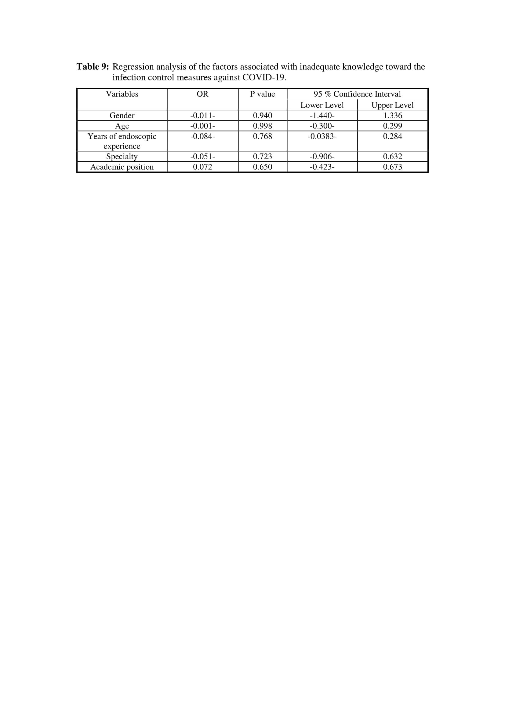 On comparison between the self-assessment level of training related to PPE according to the demographic features, there was no significant difference regarding the gender, the specialty or the years of endoscopic experience of the participants. However, the majority of participants (70 out of 120) found they had inadequate training level (table 8). On performing regression analysis, no significant factor was associated with the observed inadequate knowledge.