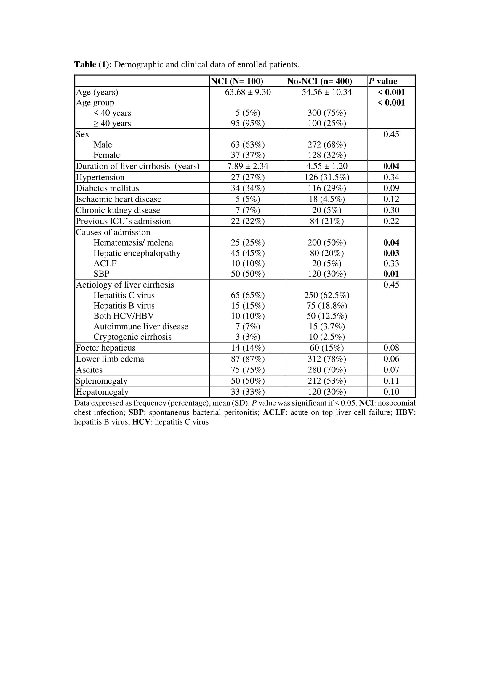 Abbreviations: NCI: nosocomial chest infection; LC: liver cirrhosis; SBP: spontaneous bacterial peritonitis; ICU: intensive care unit.