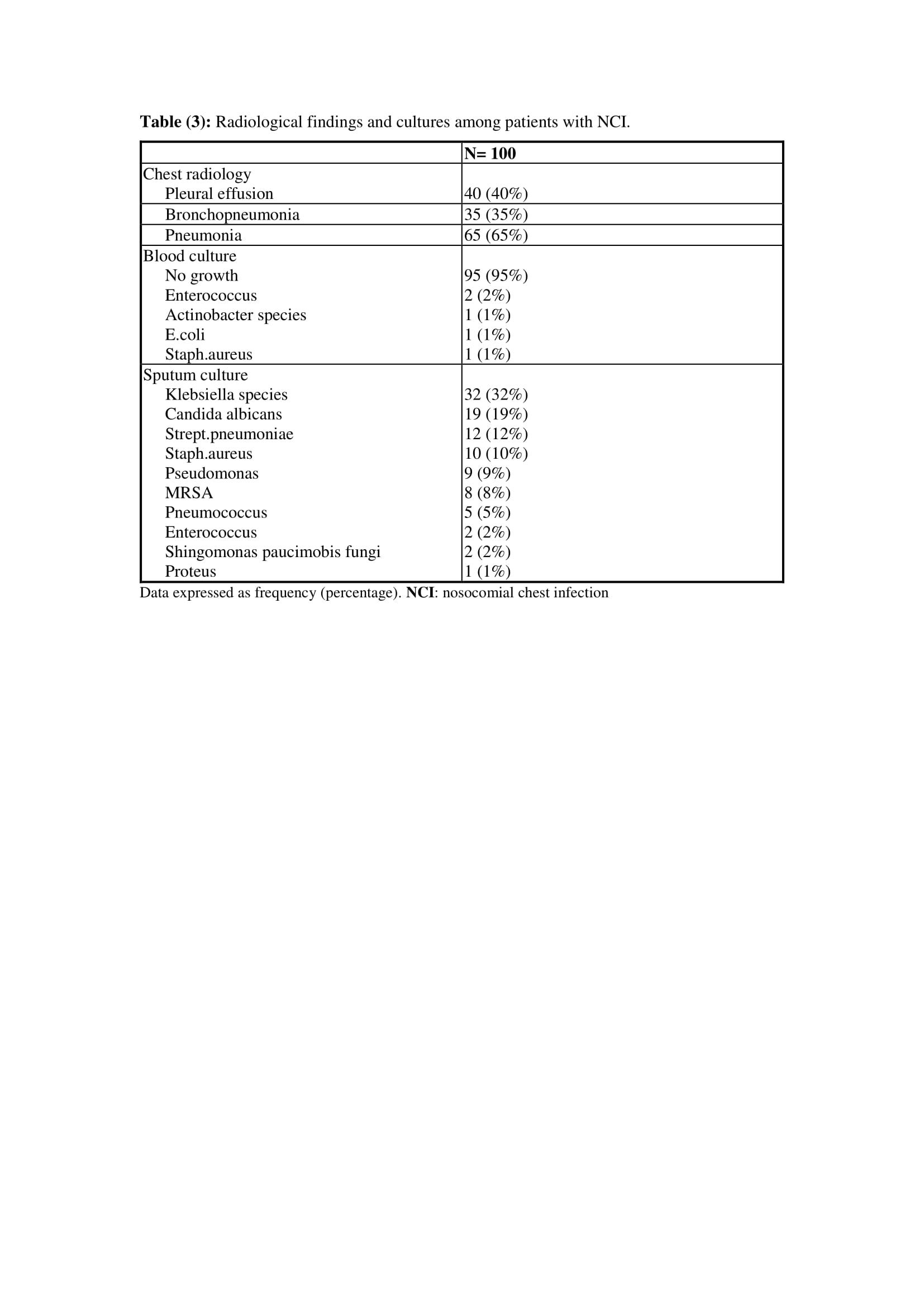 Out of studied patients with NCI; 40 (40), 35 (35%) and 65 (65%) patients had pleural effusion, bronchopneumonia, and pneumonia, respectively. Ninety five patients had no growth in blood culture. Enterococcus, Actinobacter species, E.coli and Staph.aureus were observed in 2 (2%), 1 (1%), 1 (1%) and 1 (1%) patient, respectively.