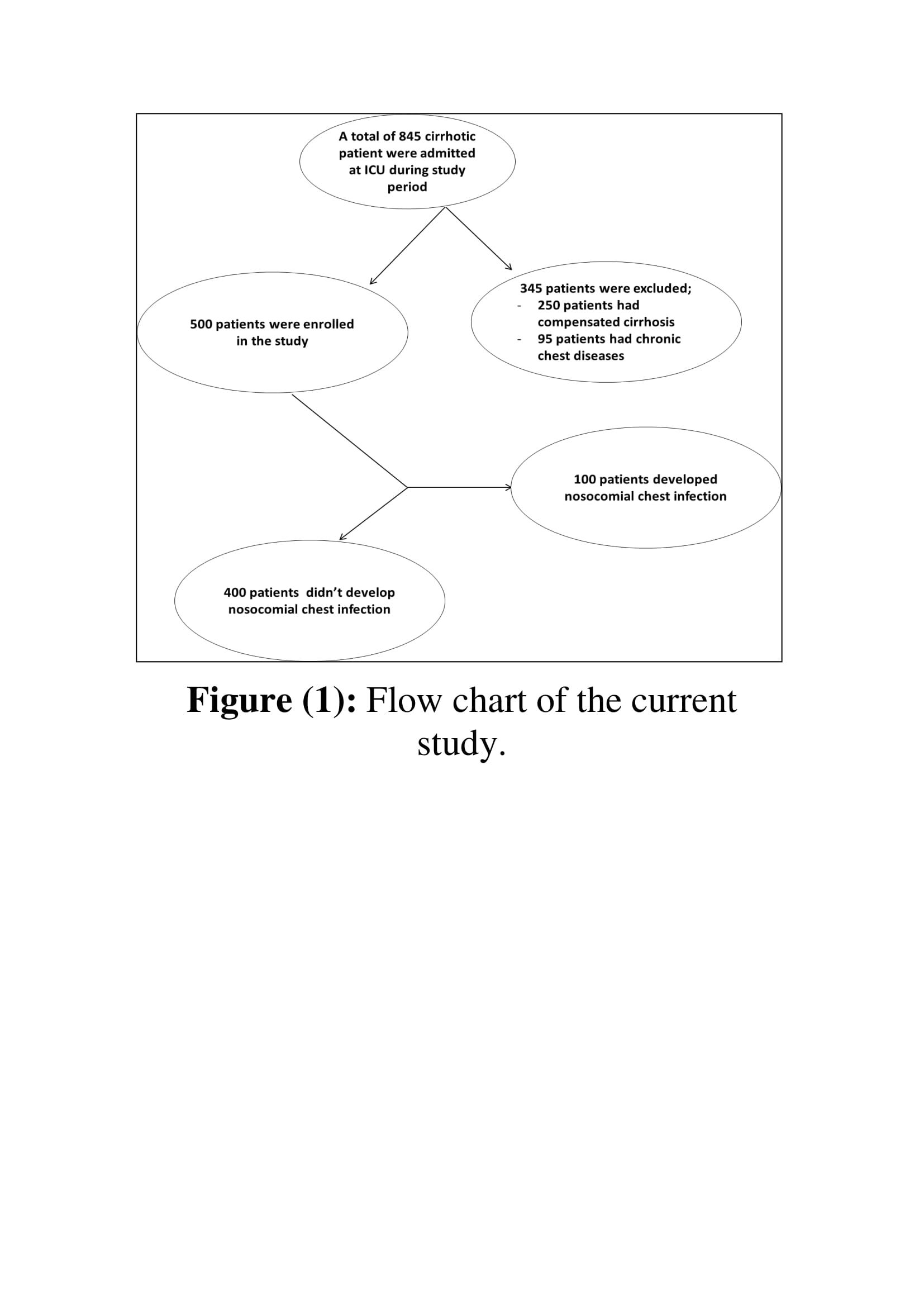 A total of 845 cirrhotic patients were admitted during the study period. 345 patients were excluded (250 patients had compensated LC (Child A)) and 95 patients had chronic chest disease). So a total 500 patients had met the inclusion criteria. Out of enrolled patients 100/500 (20%) patients developed nosocomial chest infection while 400/100 (80%) patients didn’t develop (figure 1).