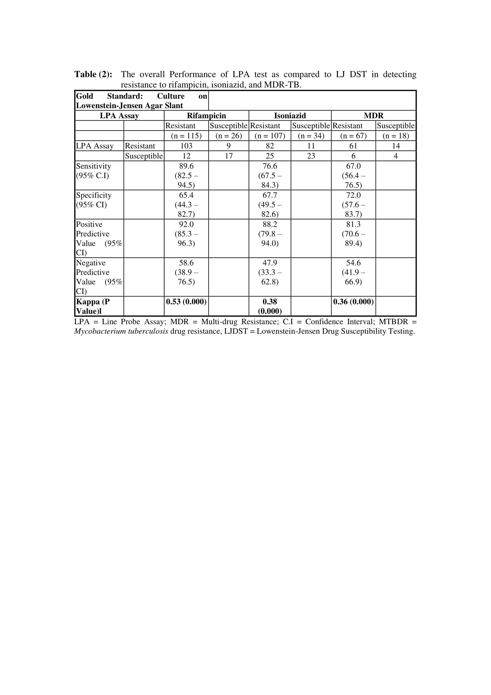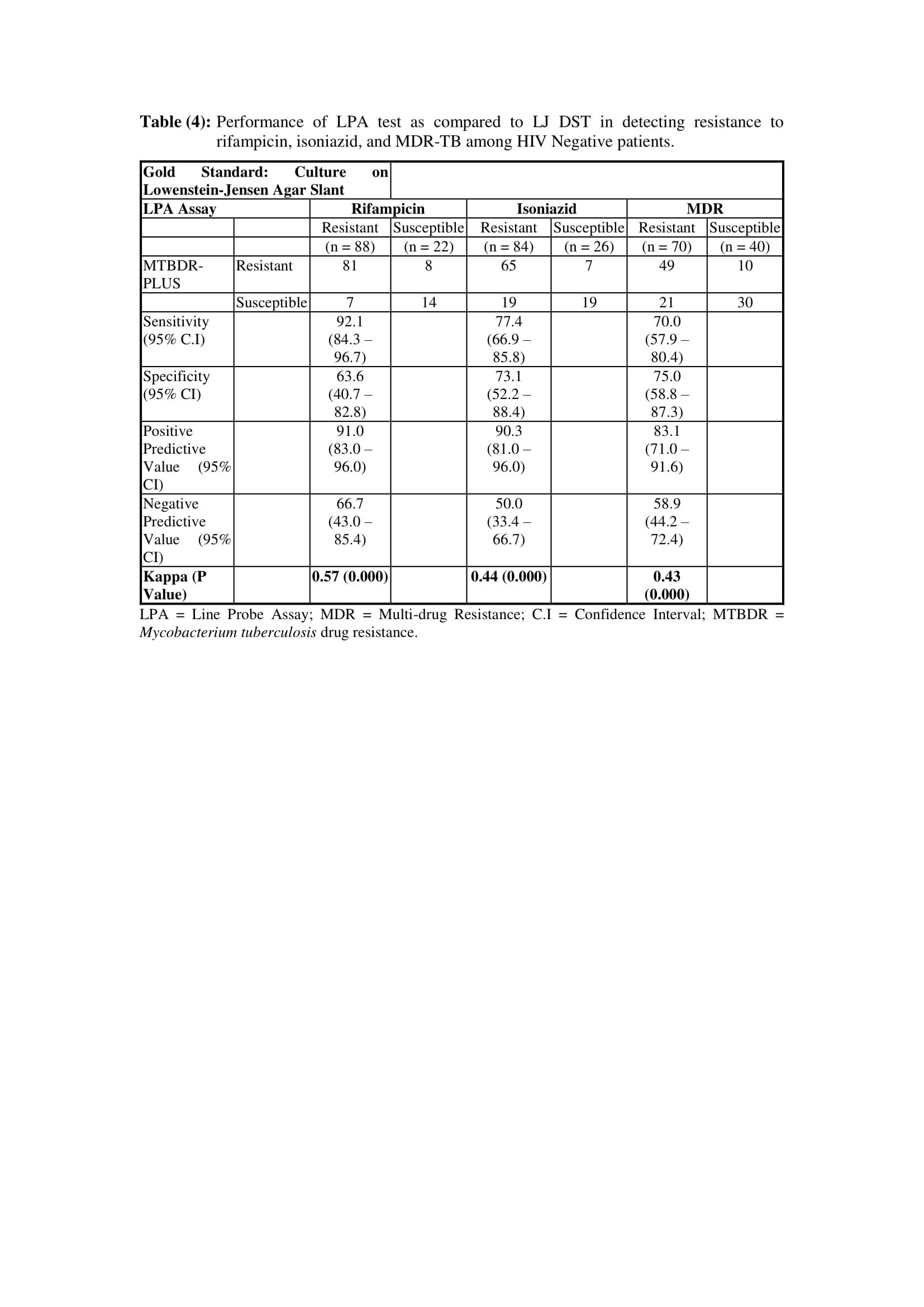 Diagnostic performance of LPA Using Phenotypic Drug Susceptibility Testing (Lowenstein-Jensen) as Gold Standard: