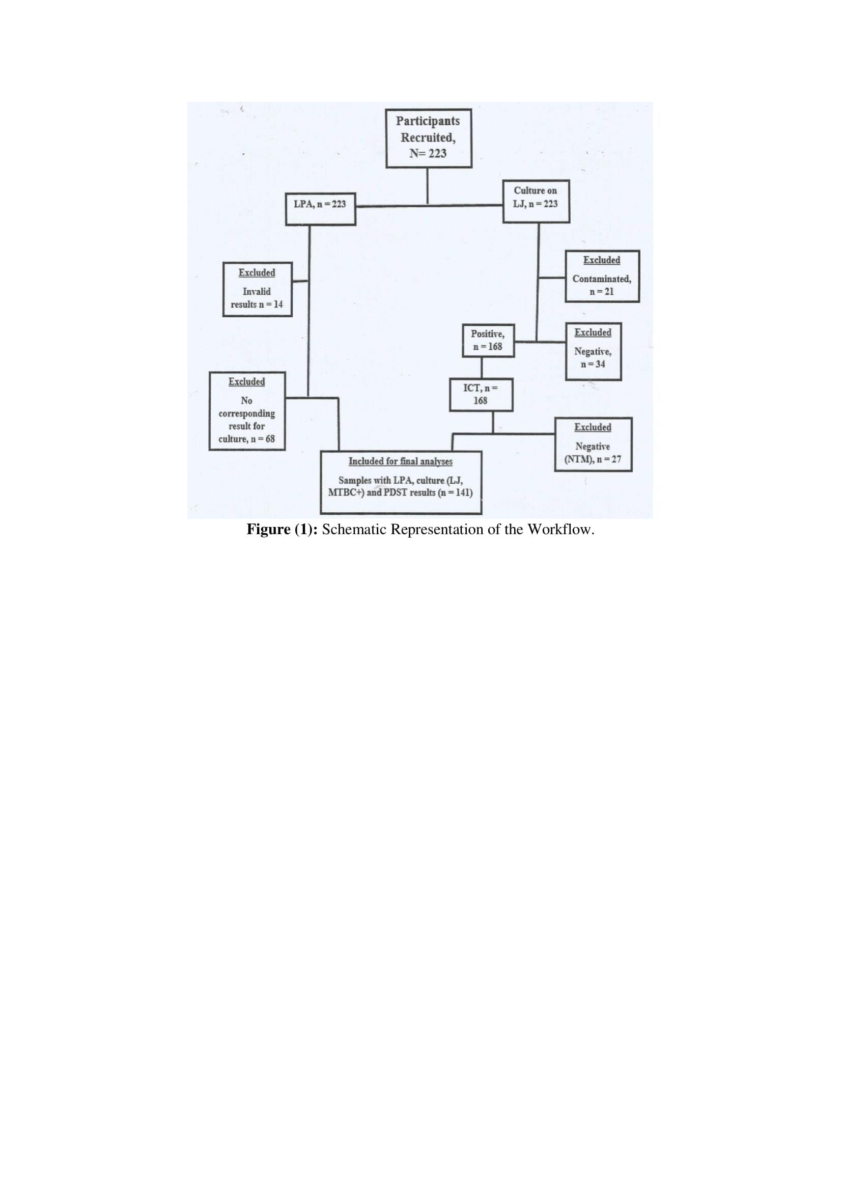 A total of 223 suspected Patients with TB were recruited in the study. Of the 223 recruited in the study, 141 patients' specimens were included in the study analyses, while 82 (36.8%) were excluded from the study analyses based on the conditions described in figure 1. Among all the patients' specimens, 168 (72.1%) were culture positive, of which 27 (12.1%) were identified as NTM. Thirty-four (15.3%) were negative by culture on LJ, and 21 (9.4%) were contaminants. LPA had 14 (6.0%) invalid results, 68 (30.5%) specimens with valid LPA results were excluded from the study analyses because they do not have the corresponding result for phenotypic drug susceptibility testing on LJ slant. Other samples that were excluded from the study analyses are presented in figure 1.