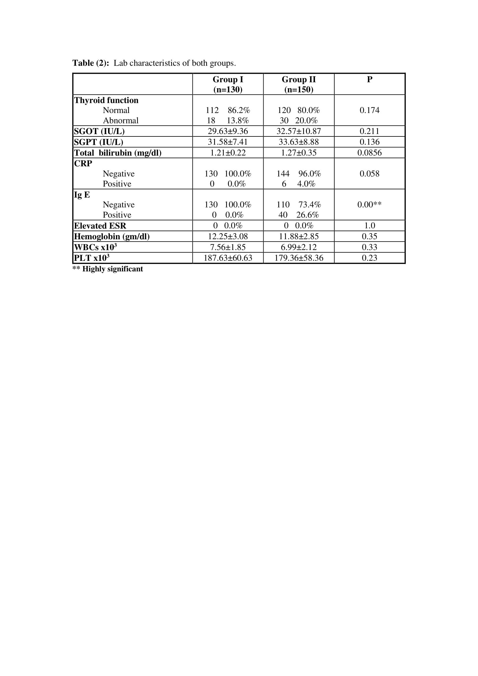 When both groups were compared regarding the common causes of persistent itching, it was clear that liver biochemical profile and thyroid function were comparable between the 2 groups (Table 2). The acute phase reactants CRP and ESR and CBC were also comparable between the 2 groups. However, the H pylori negative group had higher frequency (73.4%) of IgE positivity in comparison to none (0%) among H pylori positive group (P <0.001).