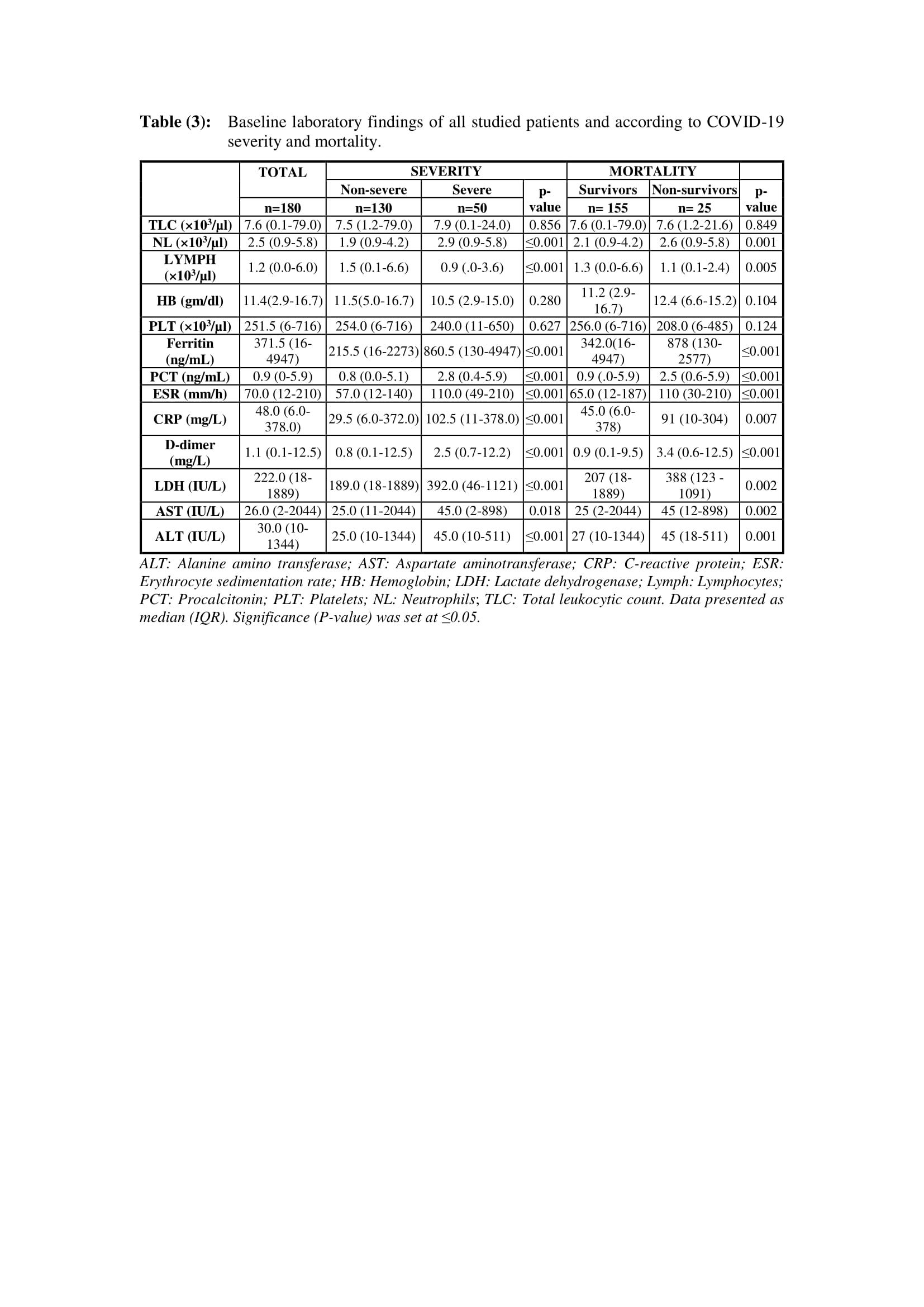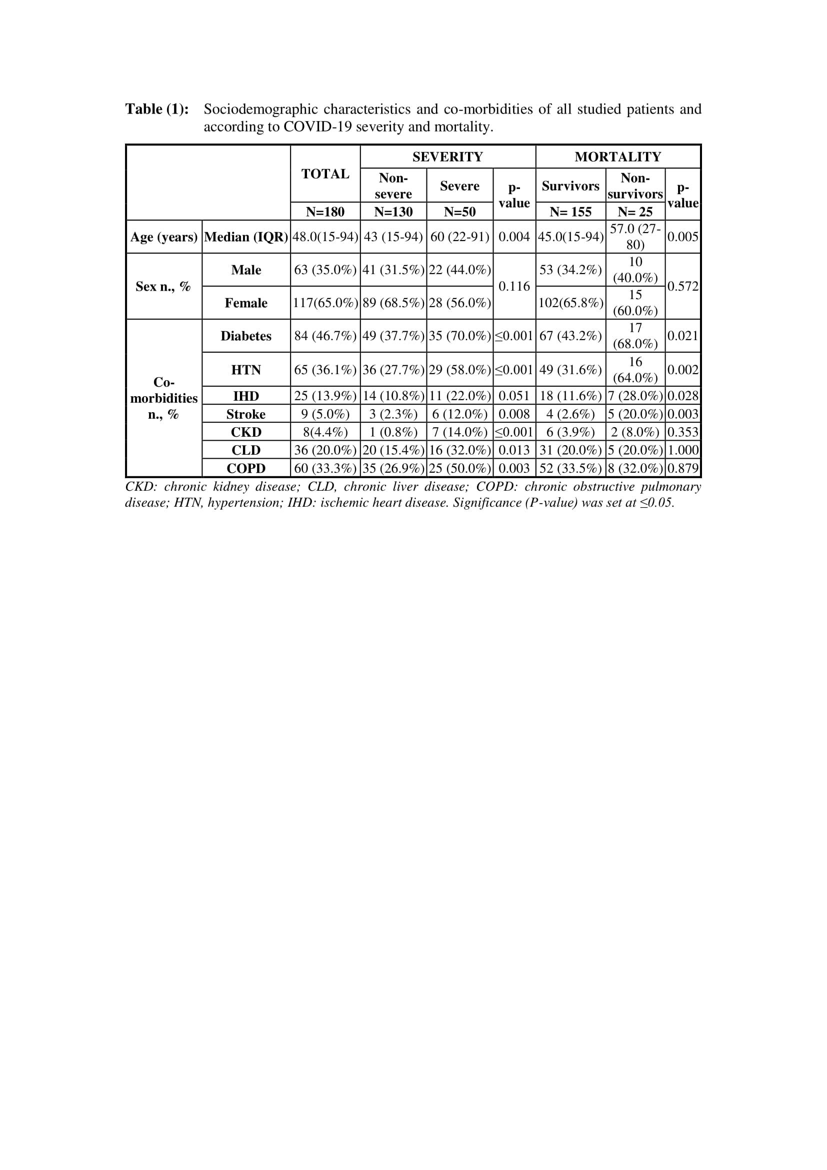 A total of 180 COVID-19 patients were enrolled in this study. Their median (IQR) age was 48 years (15-94). Thirty-five percent of the patients were males, and 65% were females. The most common associated co-morbidities were diabetes mellitus (46.7%), hypertension (36.1%), and chronic obstructive pulmonary disease (COPD) (33.3%). Of all the studied population, 27.8% (n=50) had severe disease, and 13.9% (n=25) died during their hospital stay. Patients with severe disease and those who died were significantly older compared to non-severe patients (median: 60 years (IQR:22-91) vs. 43 years (15-94); P=0.004) and survivors (57.0 years (27-80) vs. 45.0 years (15-94); P=0.005), respectively. In terms of sex, differences between the studied subgroups were not significant. Demographics and associated co-morbidities are shown in Table 1.