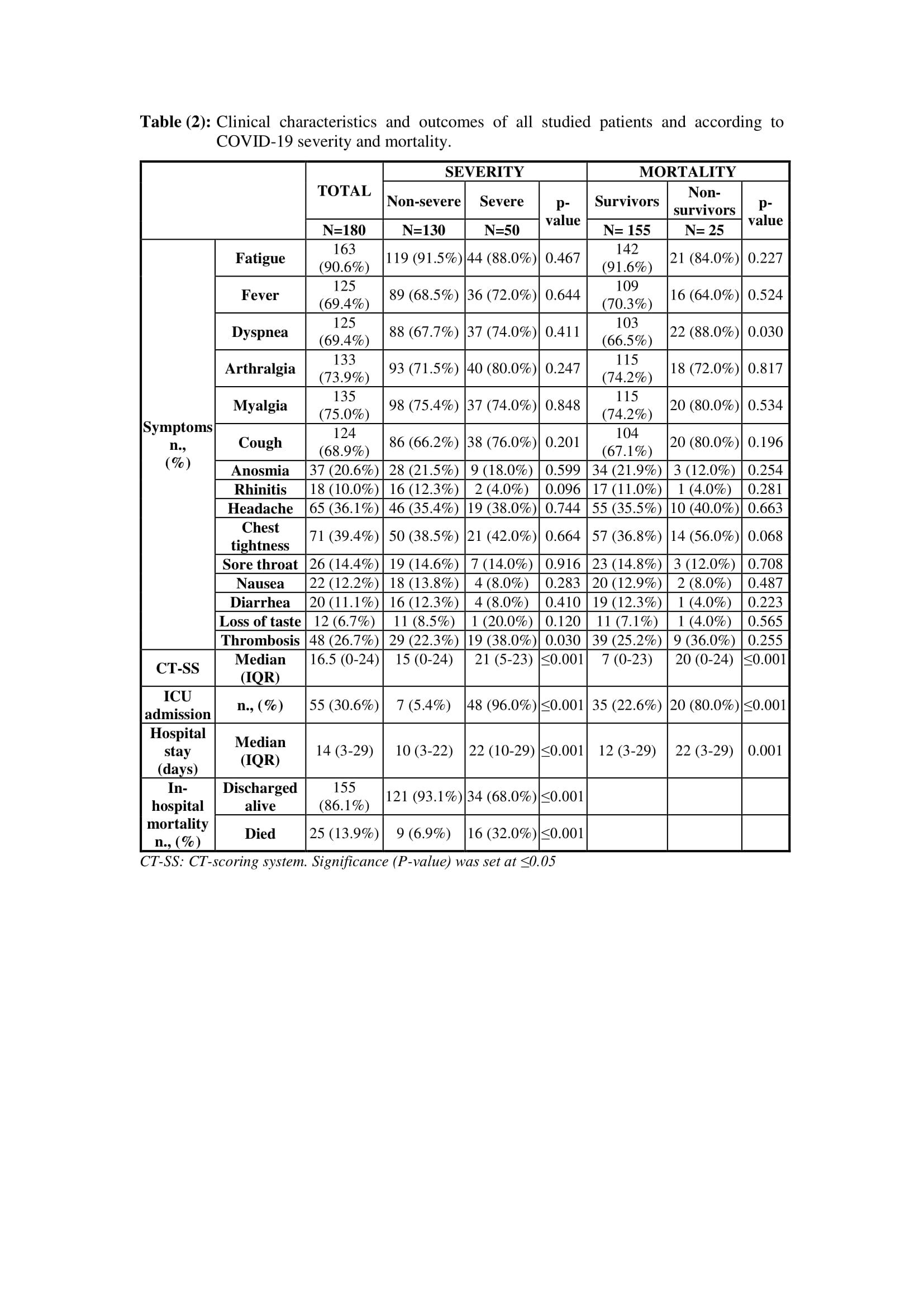 In the 180 patients, the ICU admission rate was 30.6% with significant higher rates in severe patients and non-survivors compared to non-severe patients (96.0% vs. 5.4%; P ≤ 0.001) and survivors (80.0% vs. 22.6%; P ≤ 0.001). In-hospital mortality rates were significantly higher with severe compared to non-severe disease (32.0% vs. 6.9%; P ≤ 0.001). The median (IQR) duration of hospital stay of all studied patients was 14 days (3-29), with significantly longer durations in severe patients (22 days (10-29) vs. 10 days (3-22); P ≤ 0.001) and non-survivors (22 days (3-29) vs. 12 days (3-29); P=0.001) compared to their corresponding groups.