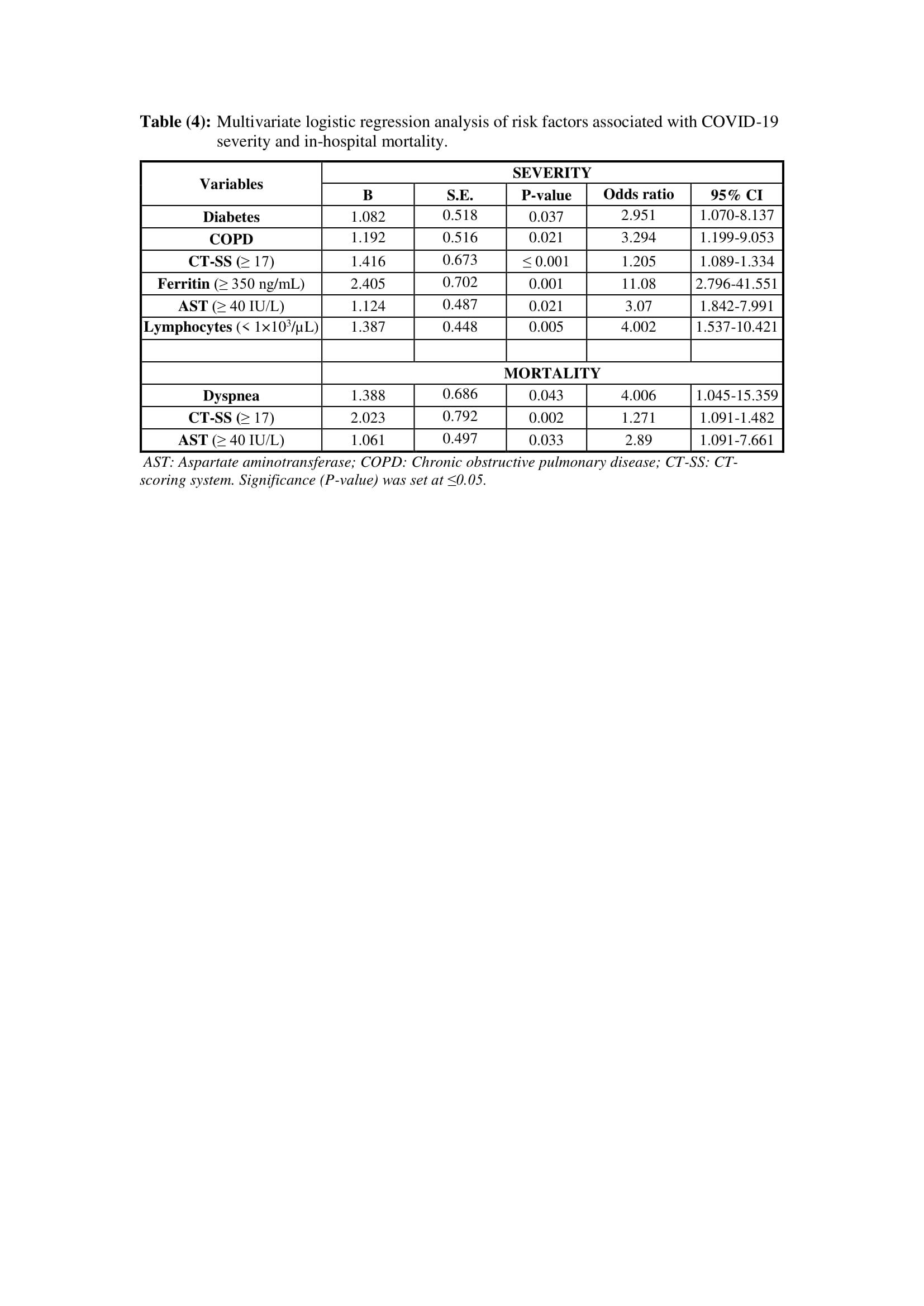 In table 4, multivariate logistic regression analysis was used to identify independent prognosis indicators associated with COVID-19 severity and in-hospital mortality. Predictors of COVID-19 severity in the studied patients were presence of COPD (OR: 3.294; 95% CI: 1.199-9.053; P= 0.021) and diabetes mellitus (OR: 2.951; 95% CI:1.070-8.137; P= 0.037) as co-morbidities, abnormal high values of ferritin ≥ 350 ng/mL (OR: 11.08; 95% CI: 2.796-41.551; P= 0.001), AST ≥ 40 IU/L (OR: 3.07; 95% CI: 1.842-7.991; P= 0.021) and CT-SS ≥ 17 (OR: 1.205; 95% CI: 1.089-1.334; P ≤ 0.001), as well as low absolute lymphocyte count < 1×103/µL (OR: 4.002; 95% CI: 1.537-10.421; P= 0.005). Dyspnea as a presenting symptom (OR: 4.006; 95% CI: 1.045-15.359; P= 0.043), CT-SS ≥ 17 (OR: 1.271; 95% CI: 1.091-1.482; P= 0.002) and AST ≥ 40 IU/L (OR: 2.89; 95% CI: 1.091-7.661; P= 0.033) were also discovered to be independent predictors of COVID-19 in-hospital mortality.