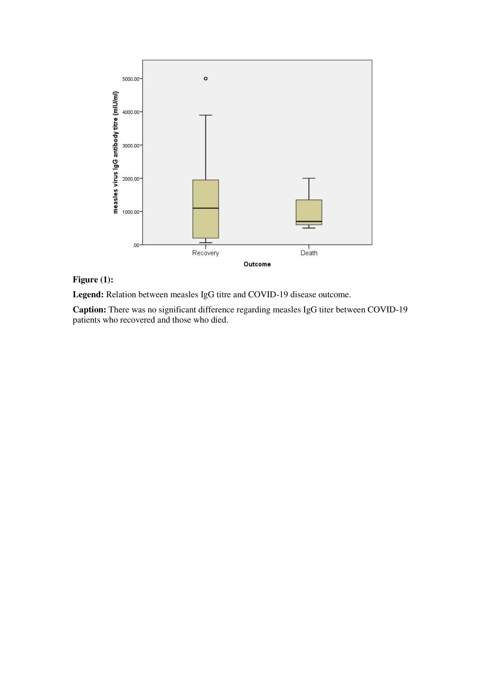 Finally, we could not find significant difference in the level of measles IgG titer between patients who recovered and those who died, therefore the current study could not prove the hypothesis of the protective role of measles vaccine.