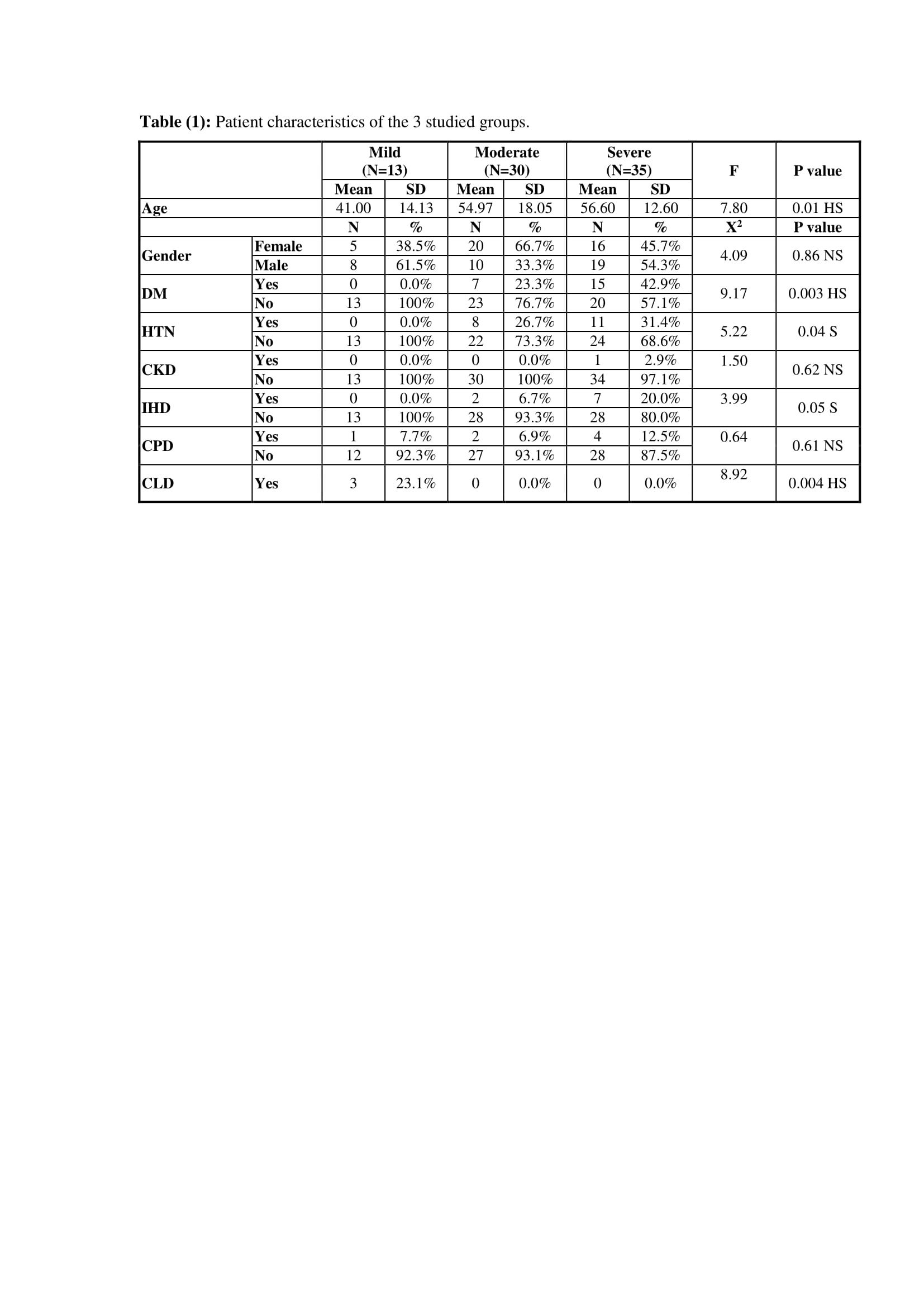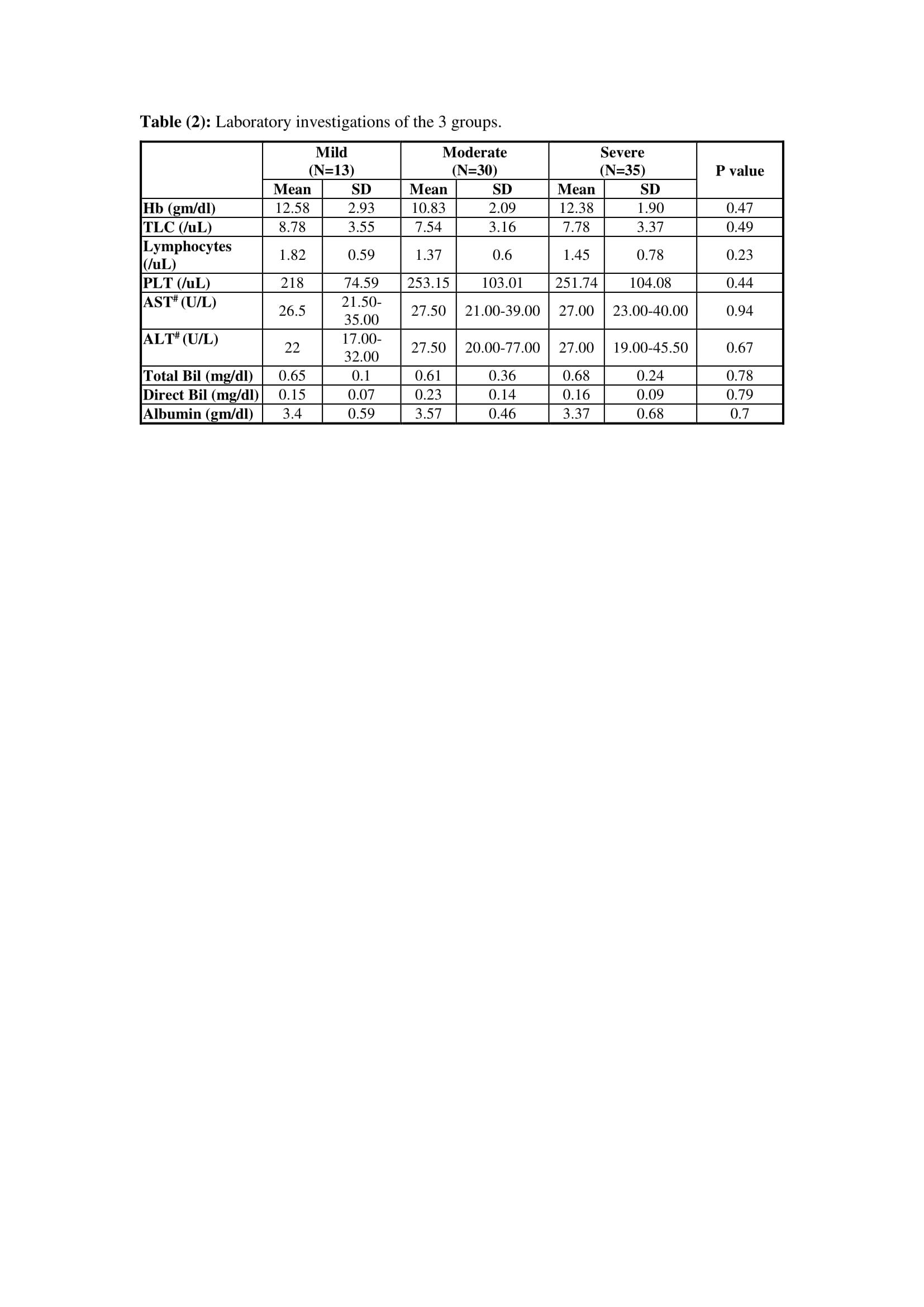 Included patients were stratified according to COVID-19 disease severity into 3 groups, mild (13 patients), moderate (30 patients) and severe (35 patients), main characteristics and laboratory investigations of the 3 groups are illustrated in tables (1) and (2). Significant differences between the 3 groups existed in age, associated co-morbidity, serum ferritin level and oxygen saturation at room air.