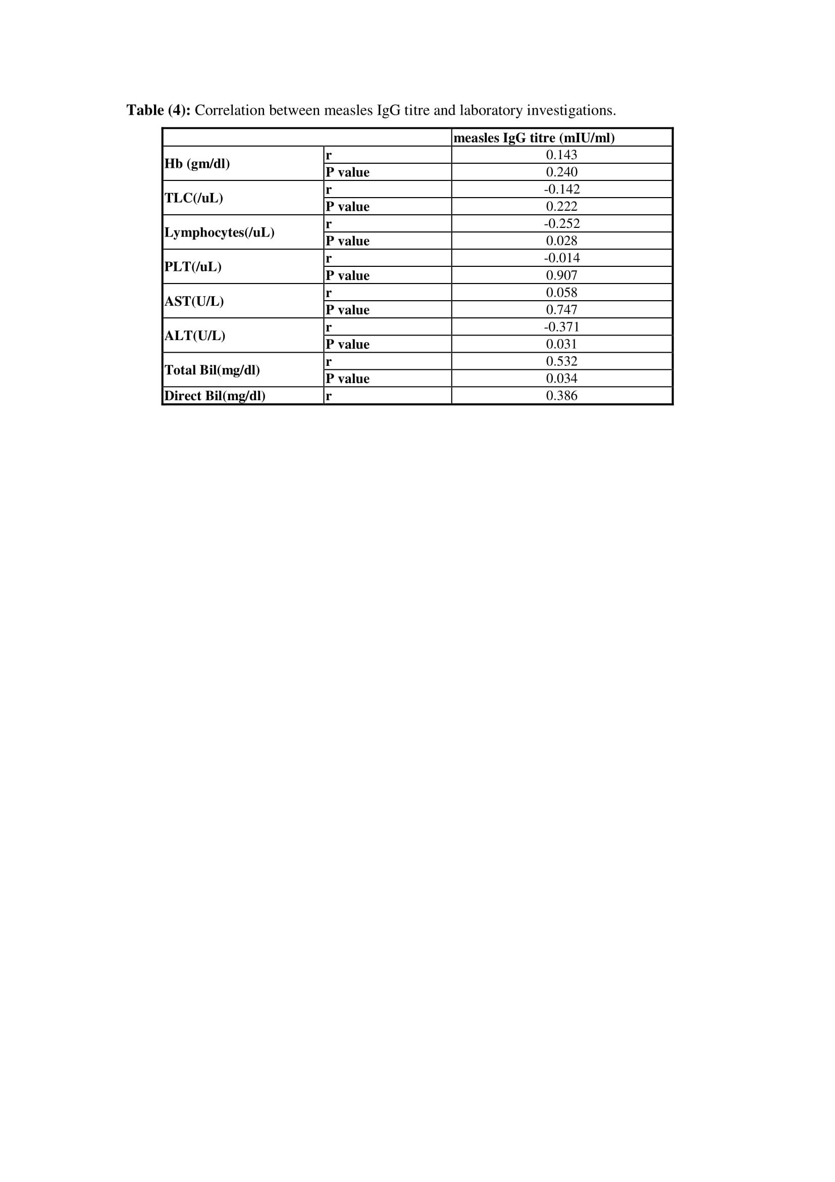 There is a significant correlation between measles IgG titer and lymphocytic count, ALT and total bilirubin. High measles IgG titer is associated with lower lymphocytic count and low ALT but with increased total bilirubin table (4).