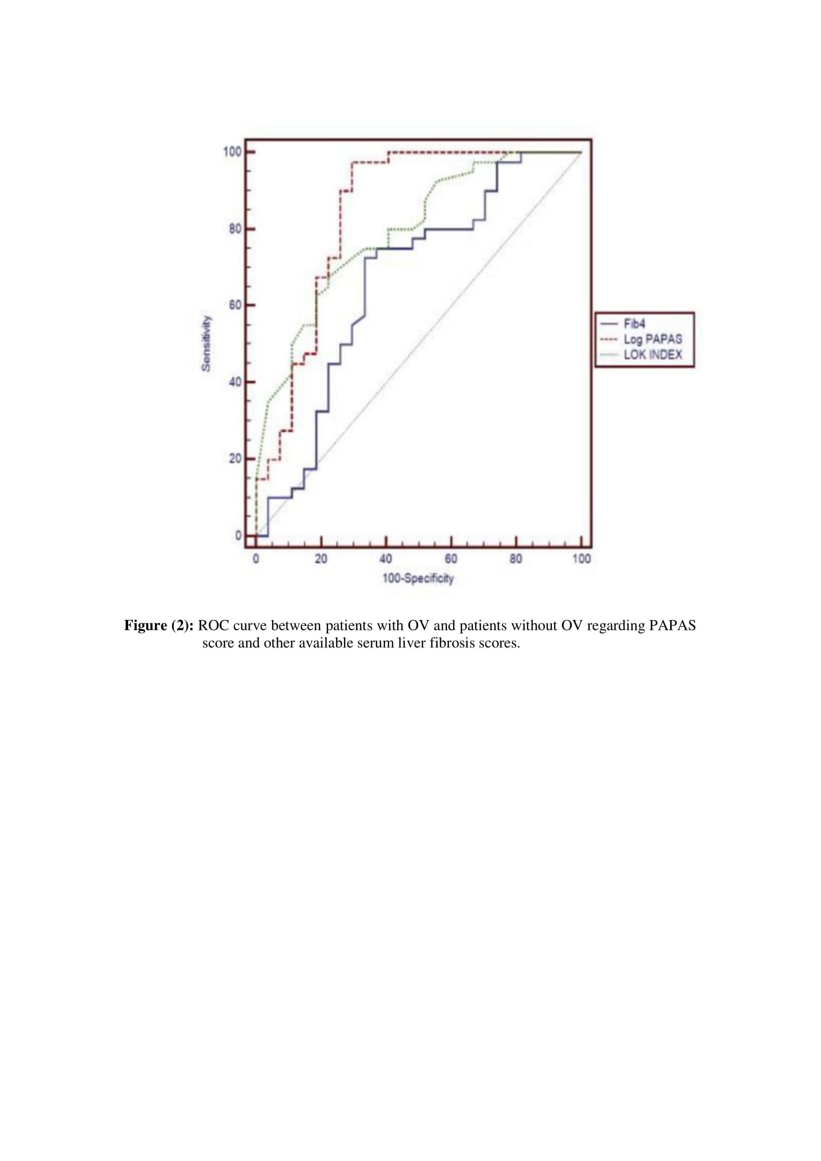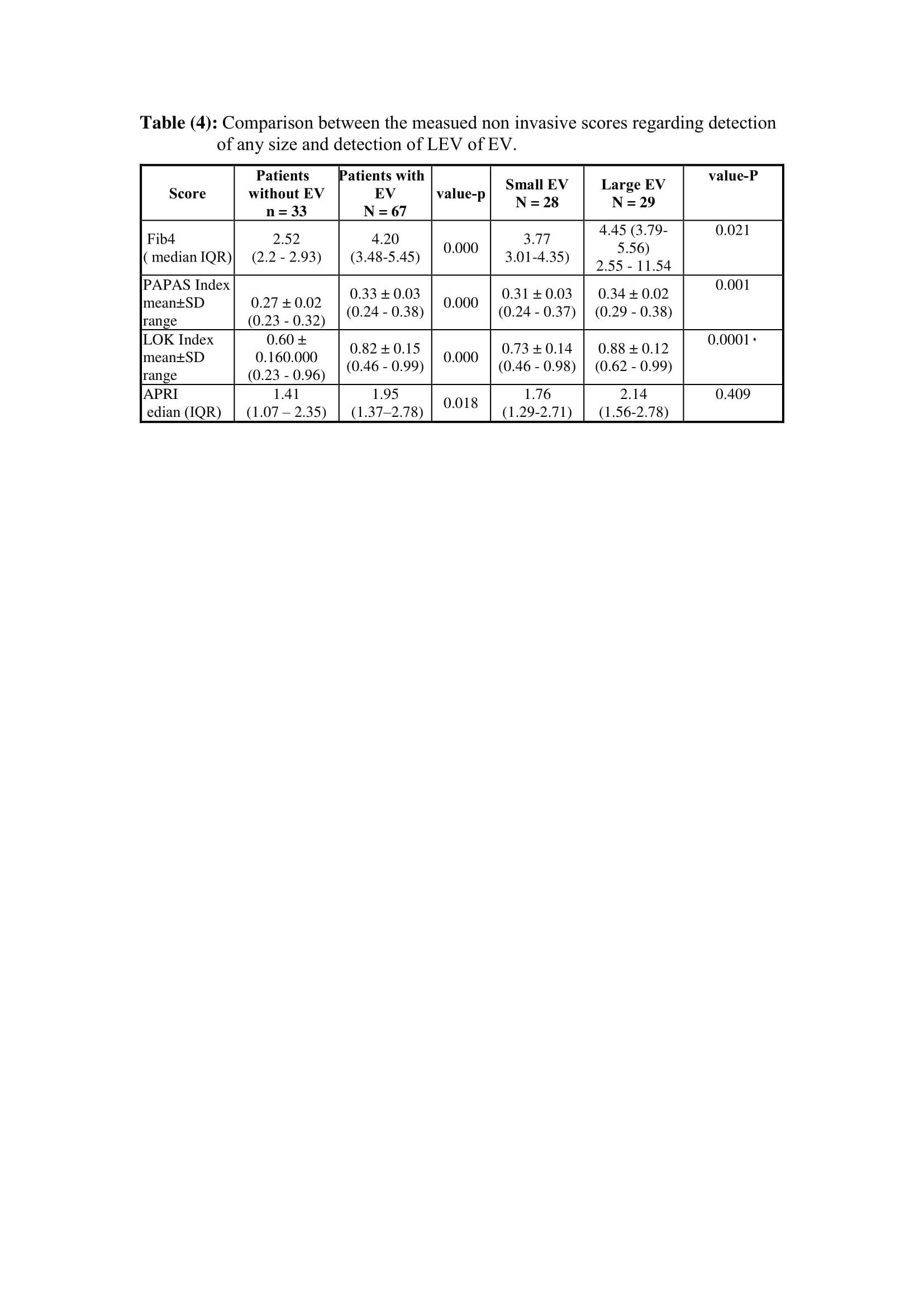 The Cutoff values for FIB-4 in the diagnosis of EVs and Large EVs are >2.78 and >4.06, respectively, with 84%, 69.23 % sensitivity and 86.67 %, 67.86 % specificity respectively (Table 3).