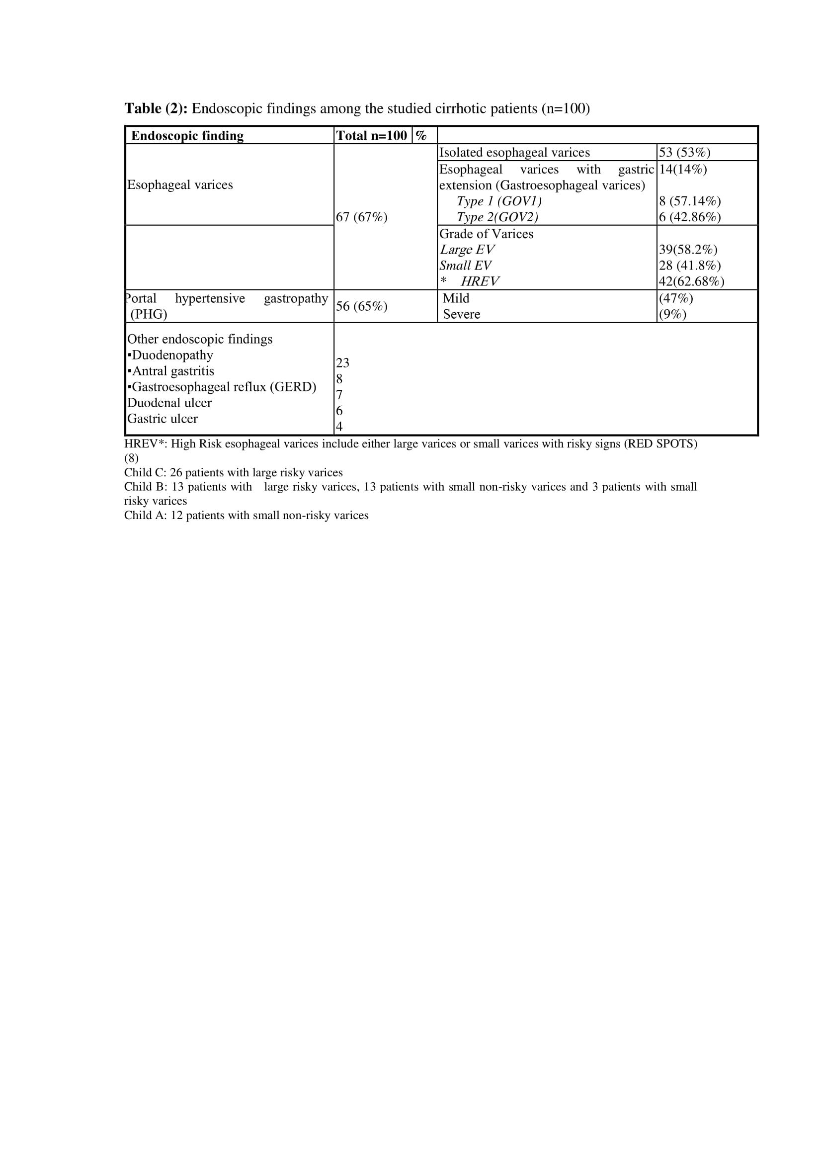 (1) Written informed consent, (2) full history taking, (3) complete clinical examination, (4) biochemical examination (complete blood count, liver profile tests (ALT, AST, Albumin, PT, alkaline phosphatase, total bilirubin, INR), antibilharzial Ab, HBsAg, HCV-Ab, and serum creatinine), and (5) Abdominal ultrasonography was performed using a Toshiba "Just vision" real-time scanner instrument with a 3.5 MHz convex transducer (after an overnight fast) with a focus on Liver size, Liver echogenicity, Presence of periportal thickening, Portal vein diameter and patency, Splenic size, Splenic vein diameter and patency. Ascites condition (6) Upper GI endoscopy to assess the presence and severity of varices, as well as any other pertinent upper GIT abnormalities. The videoscope system was a Pentax EG-3440. To avoid interobserver variability, each patient's endoscopic examination was performed by the same examiner. According to Garcia et al. [8], esophageal varices (EV) were categorized into small and large varices (small; the varices can be depressed by endoscope, large; the varices cannot be depressed by endoscope and/or confluent around the circumferential) [7]. Varices with red spots were considered to qualify as HRVs.