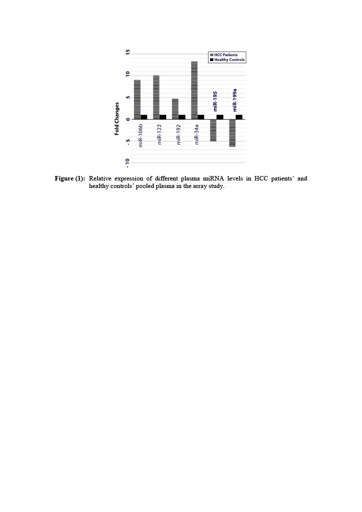 To achieve our aim, a liver microarray was used to profile the expression of 84 liver tissue-specific miRNAs in pooled plasma from pre-therapeutic HCC patients as well as healthy donors. Six miRNAs; miR-122-5p, miR-192-5p, miR-106b-5p, miR-34a-5p, miR-195-5p and miR-199a-5p, were then chosen to be evaluated as HCC biomarkers according to the array results.