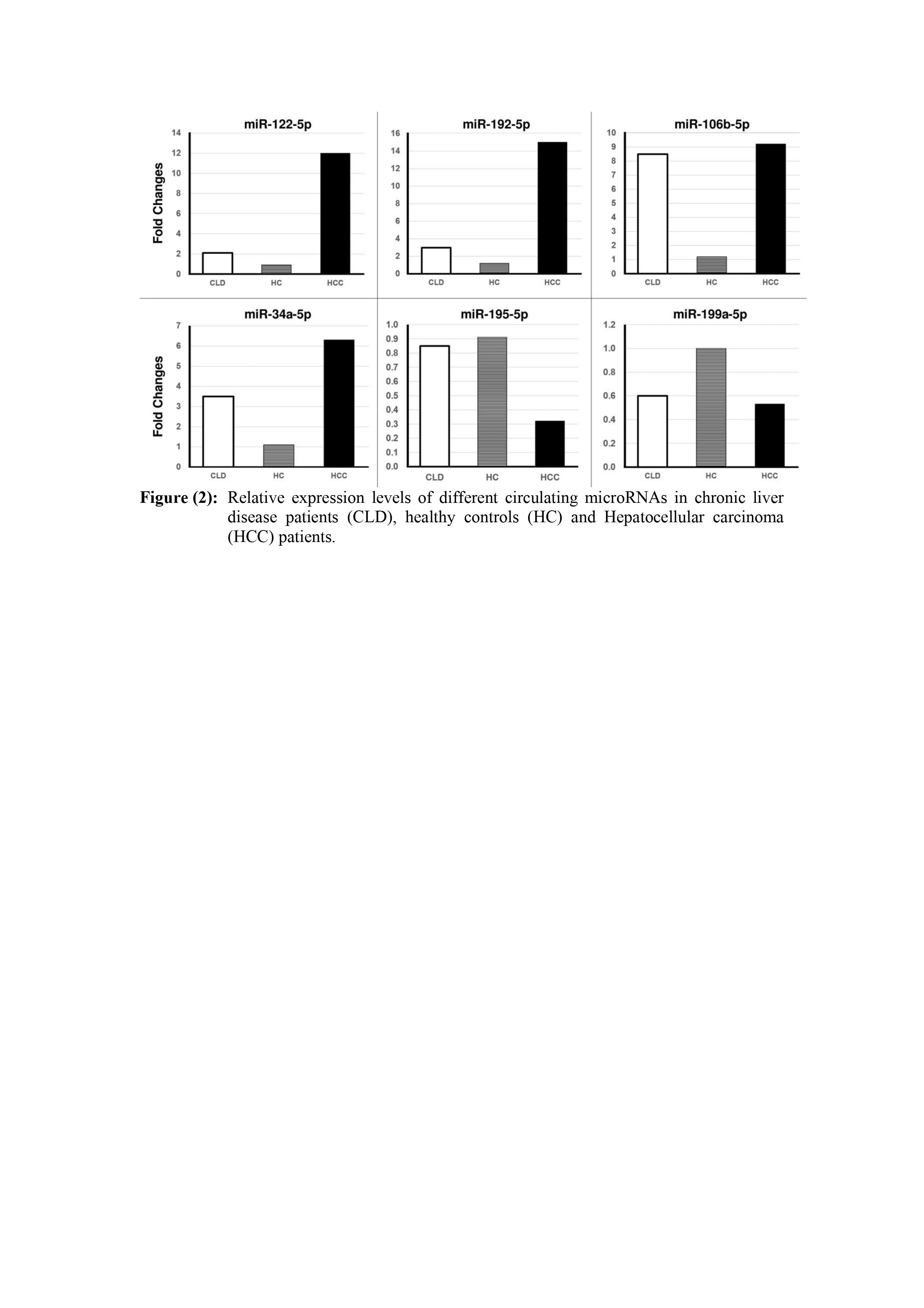 In conclusion, our studied 6 miRNAs could distinguish among HCC, CLD and healthy subjects, illustrating their potential role as noninvasive useful biomarkers in the early detection HCC. The use of a 6-miRNA panel showed a high diagnostic accuracy and better performance than the use of an individual miRNA in the diagnosis of HCC as well as in differentiating between the studied groups. Also, we evaluated the performance of our best predictors using a 2-miRNA panel (miR-195-5p/miR-192-5p), which showed a nearly similar diagnostic performance to the 6-miRNAs panel, in discriminating HCC, CLD patients and healthy controls.