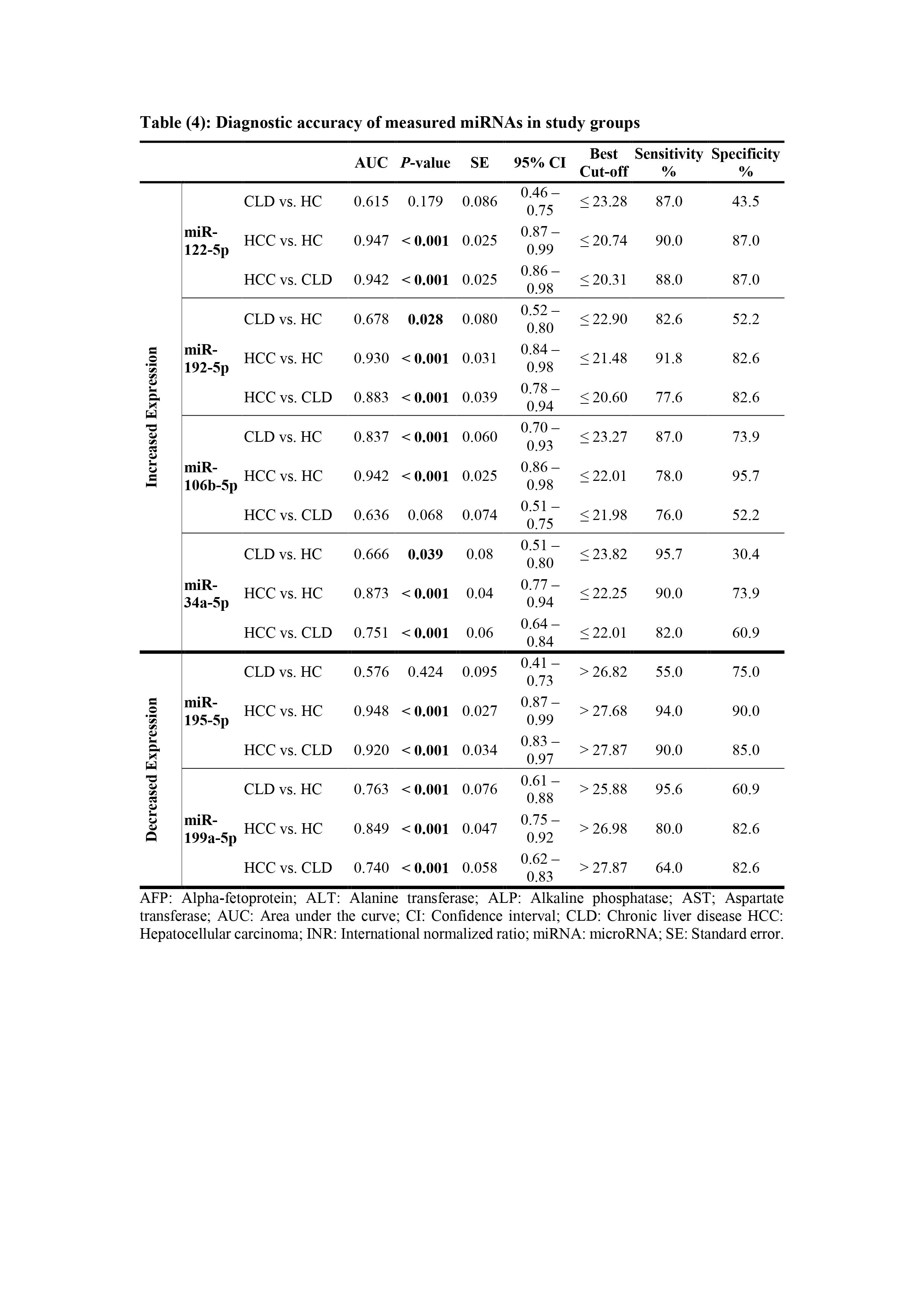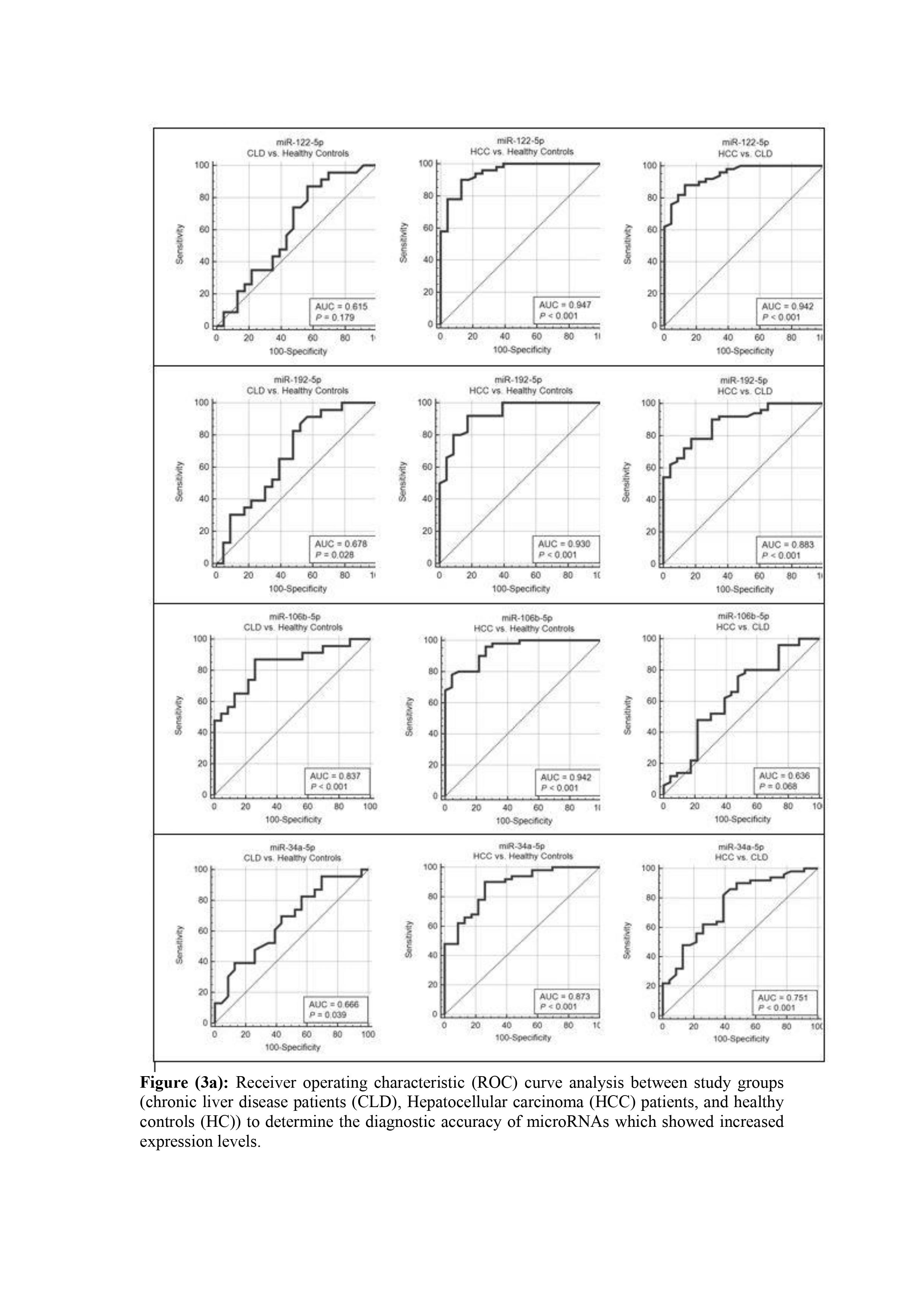 The Receiver Operating Characteristic (ROC) curve was generated to detect the diagnostic accuracy of the studied miRNAs in differentiating between HCC, CLD patients and healthy controls (Figures 3a&b). Area under the curve (AUC), P values, sensitivities, specificities and cutoff values for the studied miRNAs to differentiate HCC from CLD and control subjects are shown in table 4.
