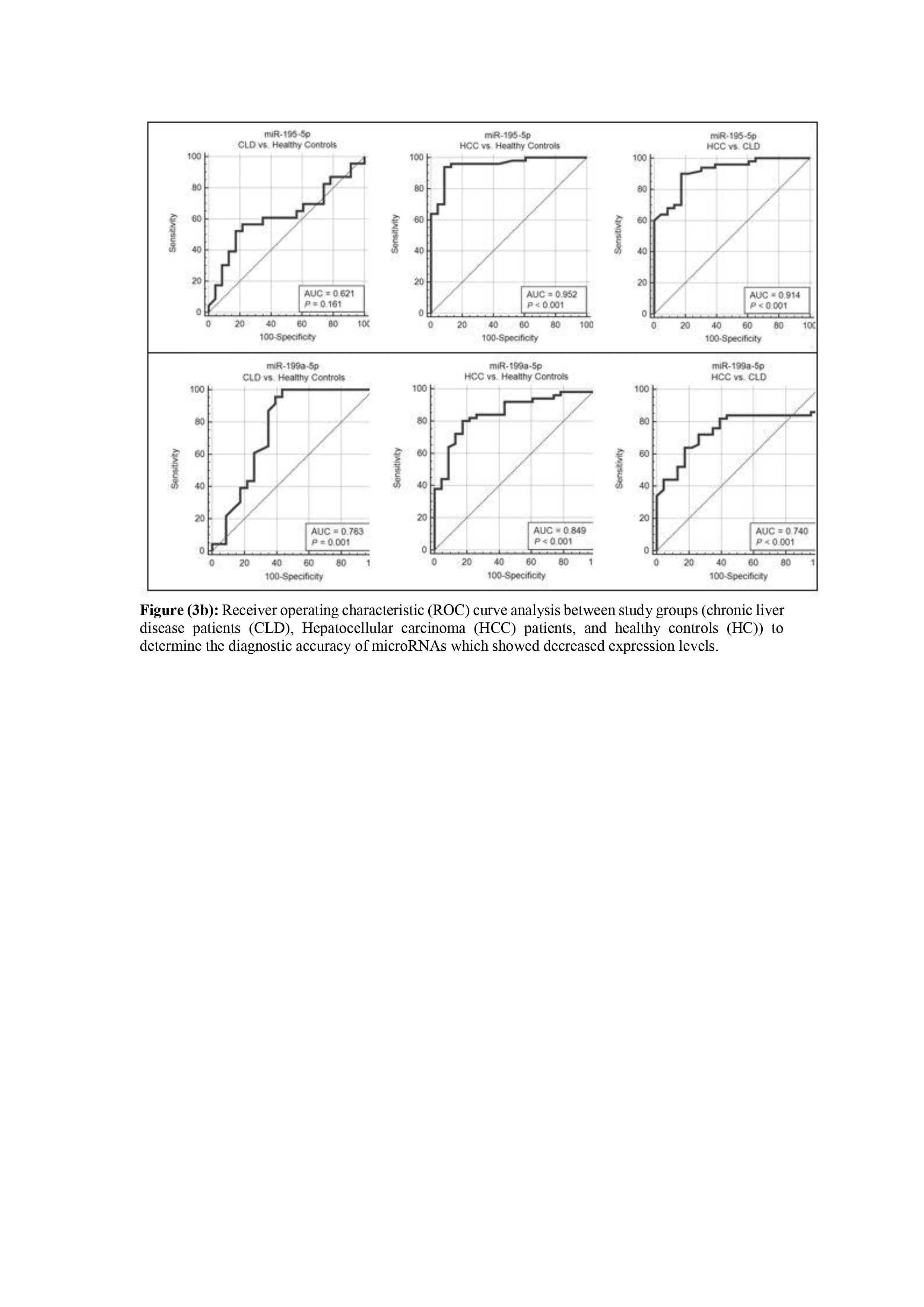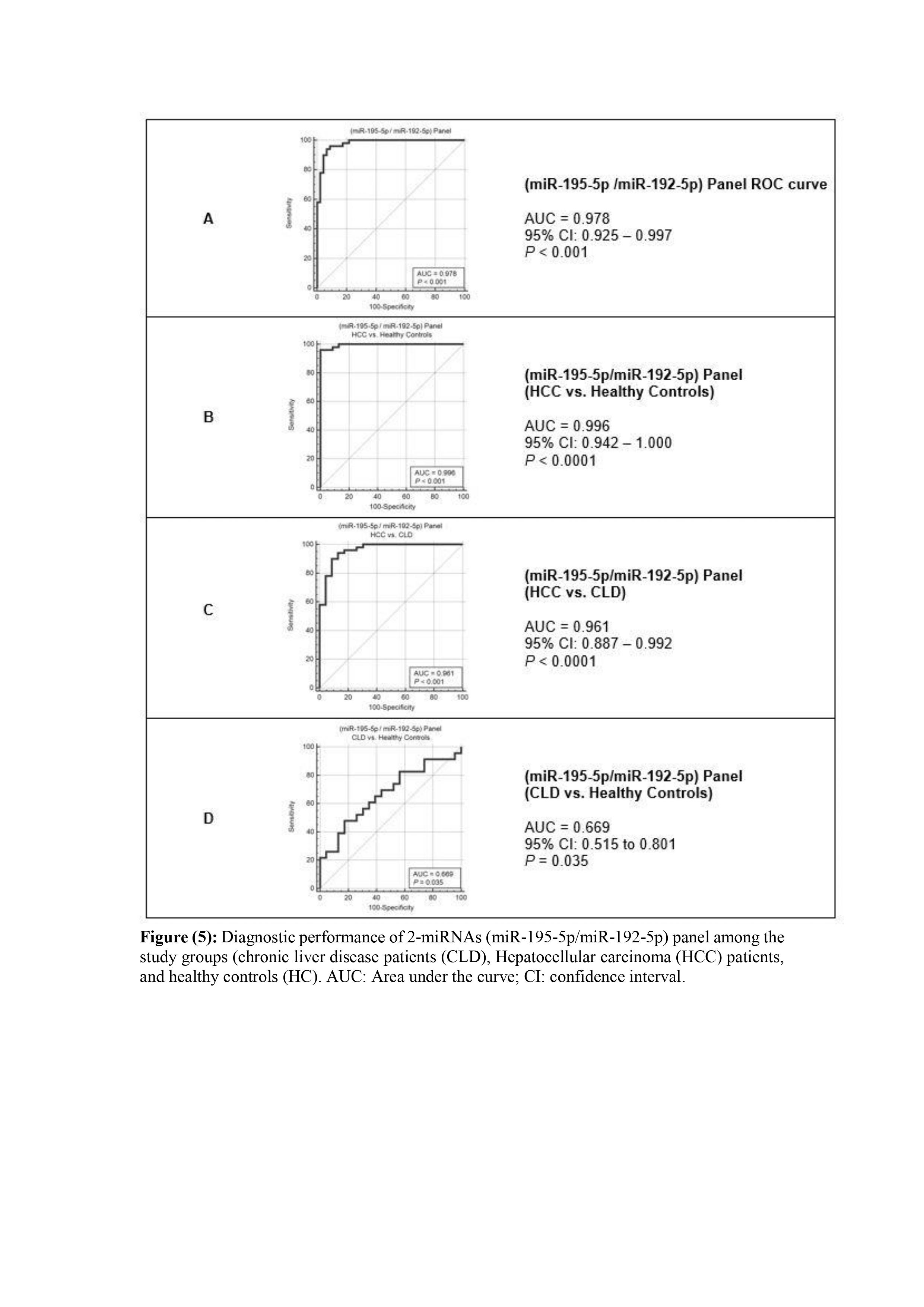 In addition, a logistic regression was made to determine the best predictor miRNA in our work, where miR-195-5p and miR-192-5p were shown to be the best predictors. Therefore, a second 2-miRNAs (miR-195-5p/miR-192-5p) panel was developed and its diagnostic performance was evaluated. Interestingly, the 2-miRNAs panel showed a similar diagnostic accuracy, in comparison to the 6-miRNAs panel, in discriminating between HCC patients and healthy controls, HCC and CLD patients as well as between CLD patients and healthy controls.