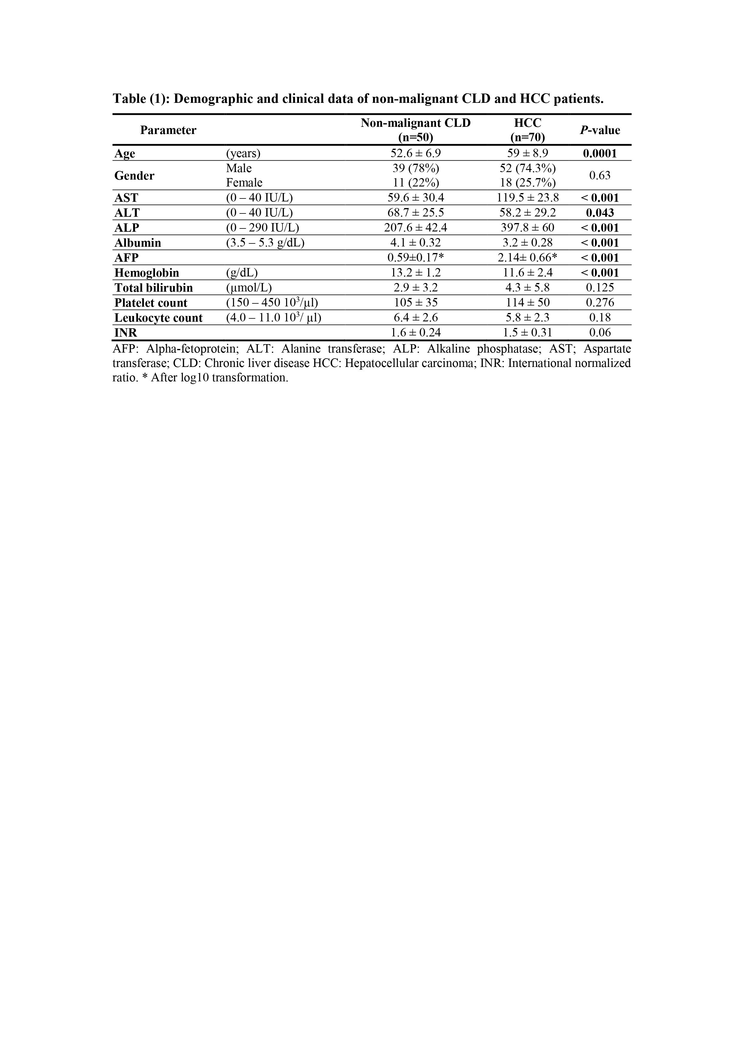 A total of 170 subjects (50 non-malignant HCV-related CLD patients, 70 HCV-related HCC patients, and 50 healthy controls) were enrolled in the current study. The CLD patients were 39 males and 11 females with a mean age ± standard deviation (SD) of 52.6 ± 6.9 years. The HCC patients were 52 males and 18 females with a mean age± SD of 59 ± 8.9 years. The difference in age between the two groups was statistically significant (P < 0.001). Statistically significant differences were detected in aspartate transferase (AST), alanine transferase (ALT), alkaline phosphatase (ALP), albumin, and hemoglobin levels among CLD and HCC groups. Regarding AFP, a log transformation of the dataset was done using Log10 transformation to convert the skewness pattern to the normal distribution one. A statistically significant difference was also detected in AFP levels among CLD and HCC groups (P < 0.001) (Table 1).
