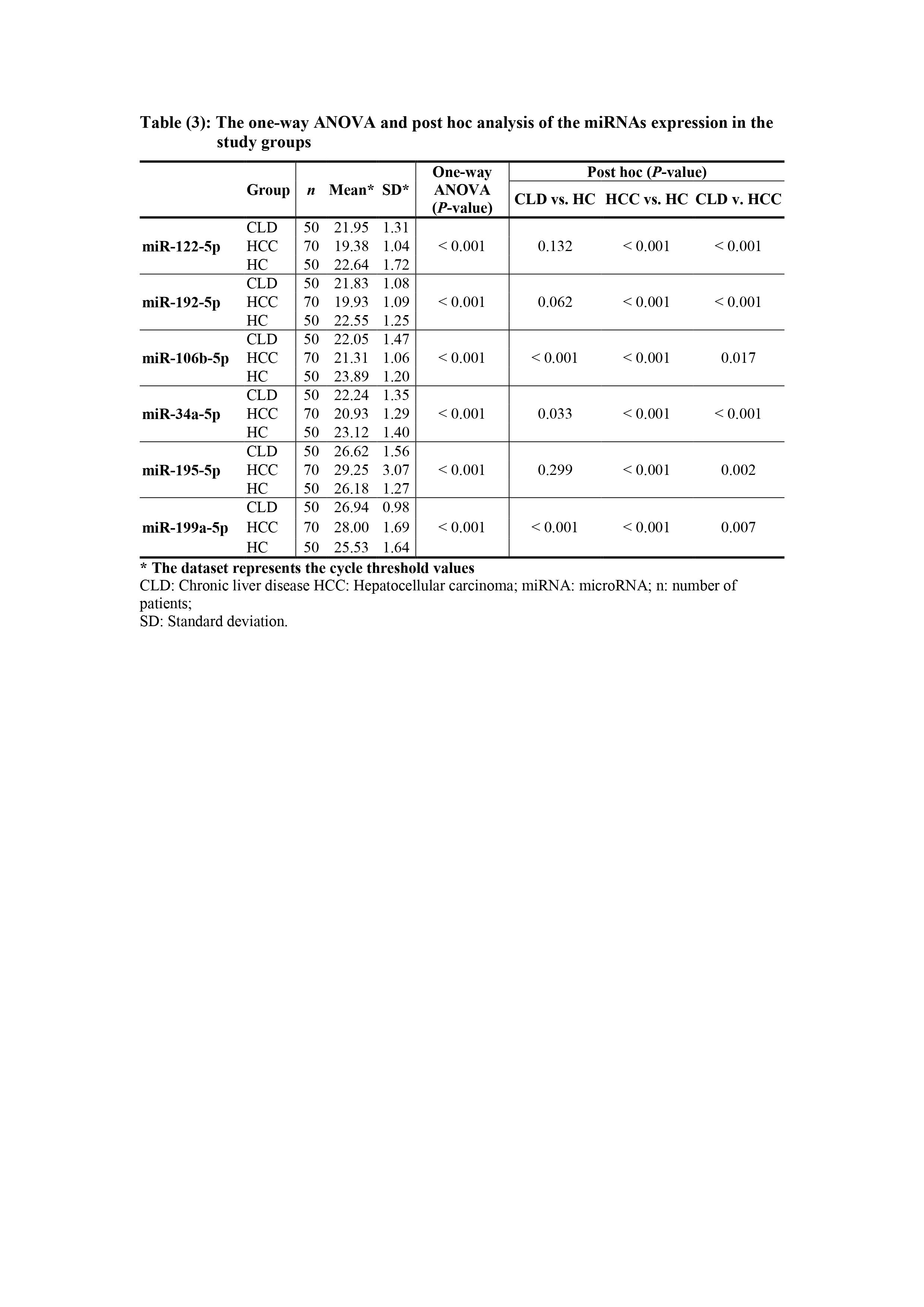 The descriptive analysis, one-way ANOVA and post hoc tests of the miRNAs Ct values in different study groups are shown in table 3.