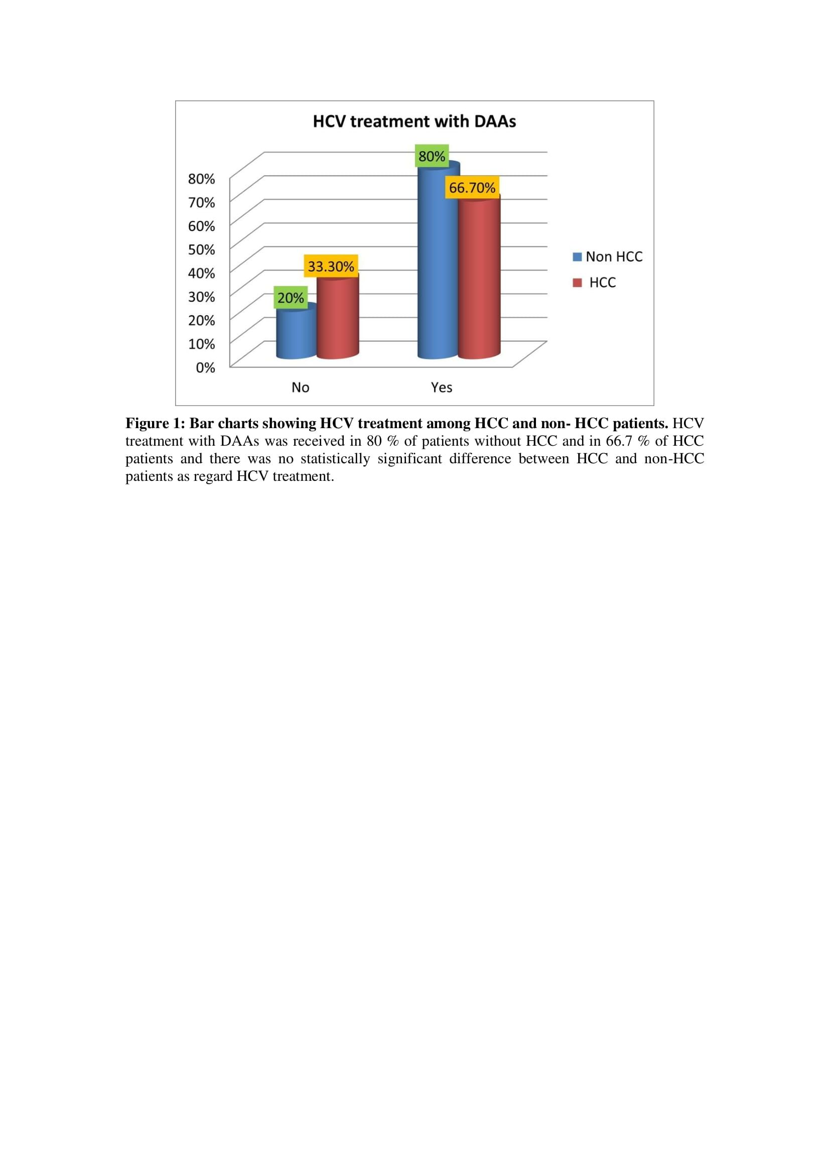 The study included 56 HCV positive patients received HCV treatment with DAAs. 39 patients received sofosbuvir/daclatasvir and ribavirin for 3 months, and 11 patients received sofosbuvir and ribavirin for 6 months, and other remaining patients take either sofosbuvir/ledipasvir or sofosbuvir/simeprevir. HCC diagnosed in 4 patients of cirrhotic patients treated with DAAs and in 2 patients of cirrhotic HCV does not receive treatment. There was no statistically significant difference between HCC and non-HCC patients as regard HCV treatment with DAAS (Table 4 – Figure 1).