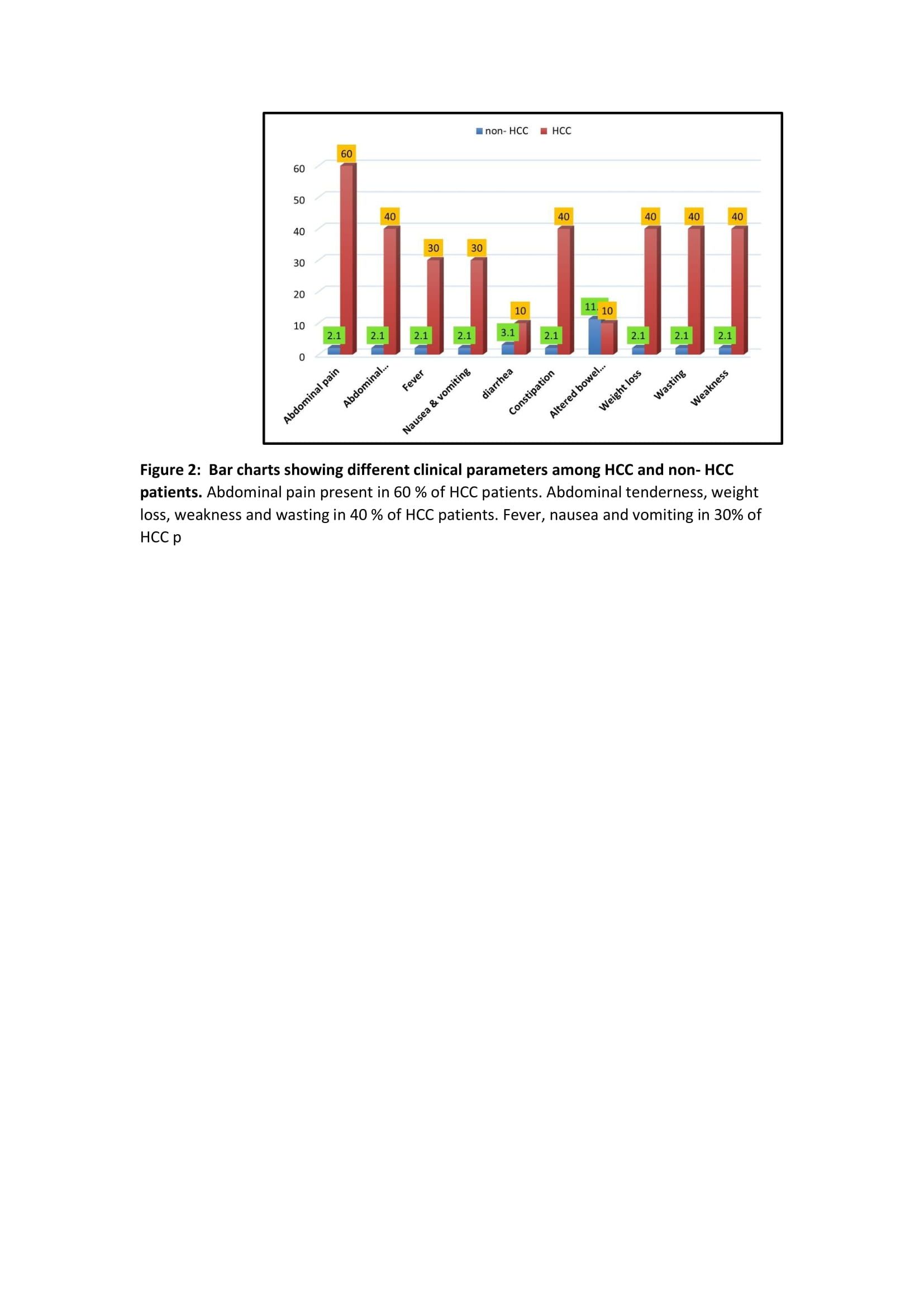 Regarding clinical picture, there was statistically significant difference between HCC and non-HCC patients as regard abdominal pain, tenderness, fever, weight loss, wasting and weakness (Figure 2).