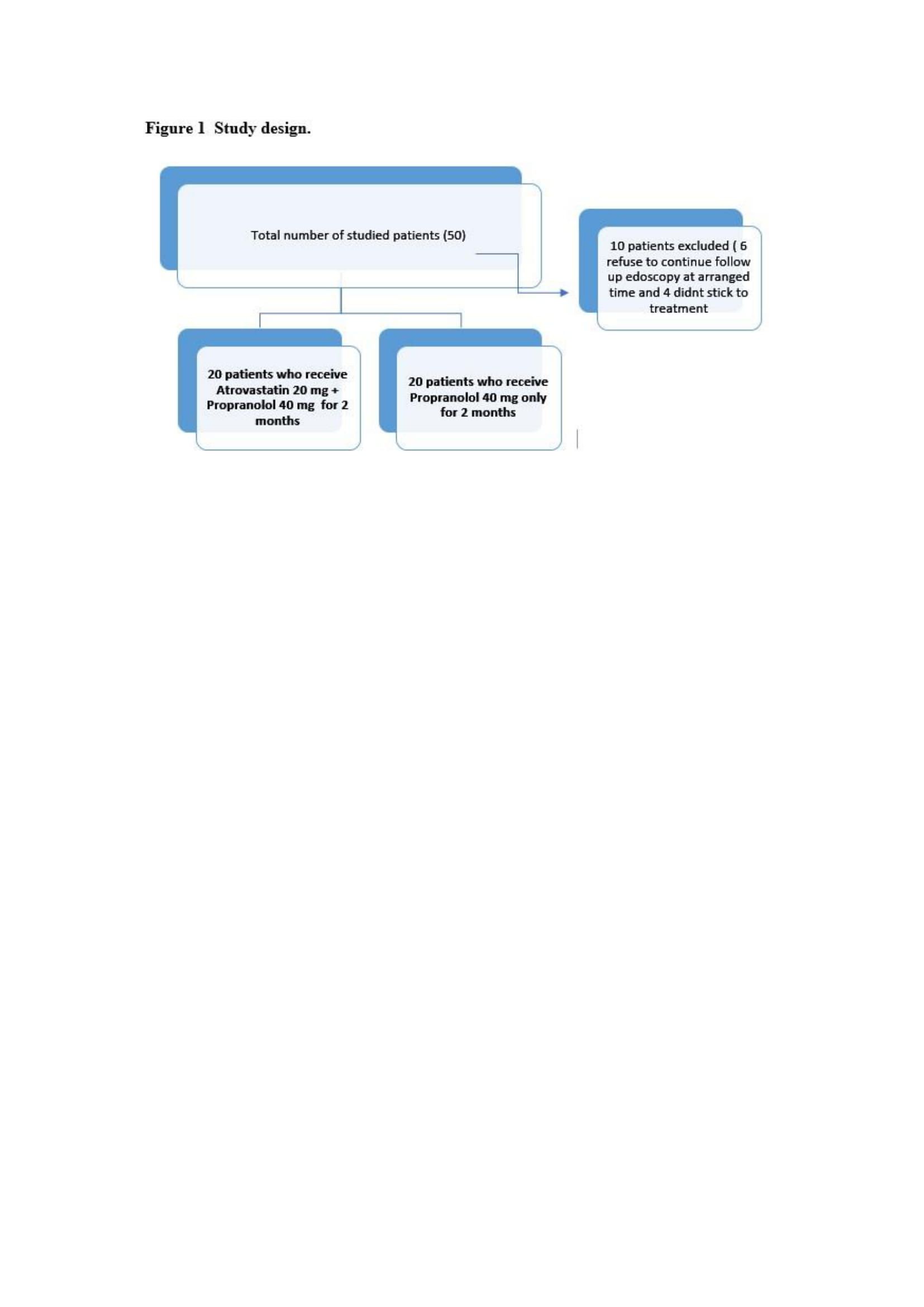 We included forty cirrhotic patients with PHT from September 2019 to September 2020. Patients were randomized by use of a computer generated random sequence into two groups: Group A cirrhotic patients who administered 20 mg of atorvastatin and 40 mg of propranolol daily for two months (n=20); (and) Group B:included 20 cirrhotic Patient who received 40 mg of propranolol daily alone for two months (n=20) (Figure 1).