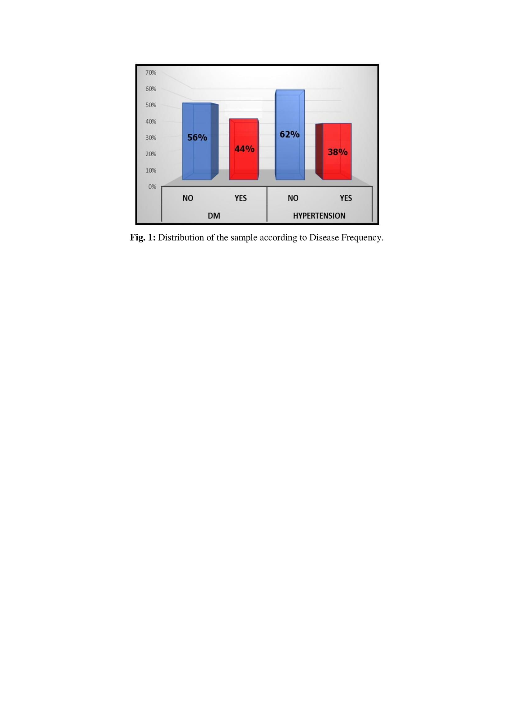 A total of 50 patients were enrolled in this study. Of them 25 were males and 25 were females. The patient’s age ranged between 26 and 58 years with a mean of 32.4 years. About half (44%) of the sample were smokers. As regard co-morbidity, 22 of patients were diabetic (44%) while 28 patients were non-diabetic (56%). Also, 19 patients were hypertensive (38%) and 31 of patients were non-hypertensive (62%) (Fig. 1).