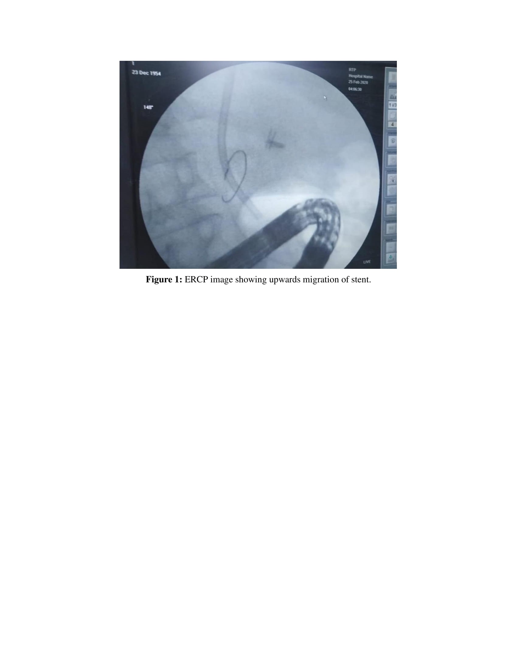 Our case developed progressive post ERCP cholestasis mostly due to inadequate antibiotic treatment of cholangitis due to premature discharge of the patient from the hospital without receiving the antibiotics. Renal impairment subsequently developed and this markedly worsened the general condition of the patient and threatened his life. The patient was managed with plasma ultrafiltration followed by a drop of the total bilirubin. Unfortunately obstruction of the stent occurred and ERCP was done with stone extraction, extraction of occluded upward migrated stent (Fig. 1). Follow up serum bilirubin was done for 3 months till it came to normal.