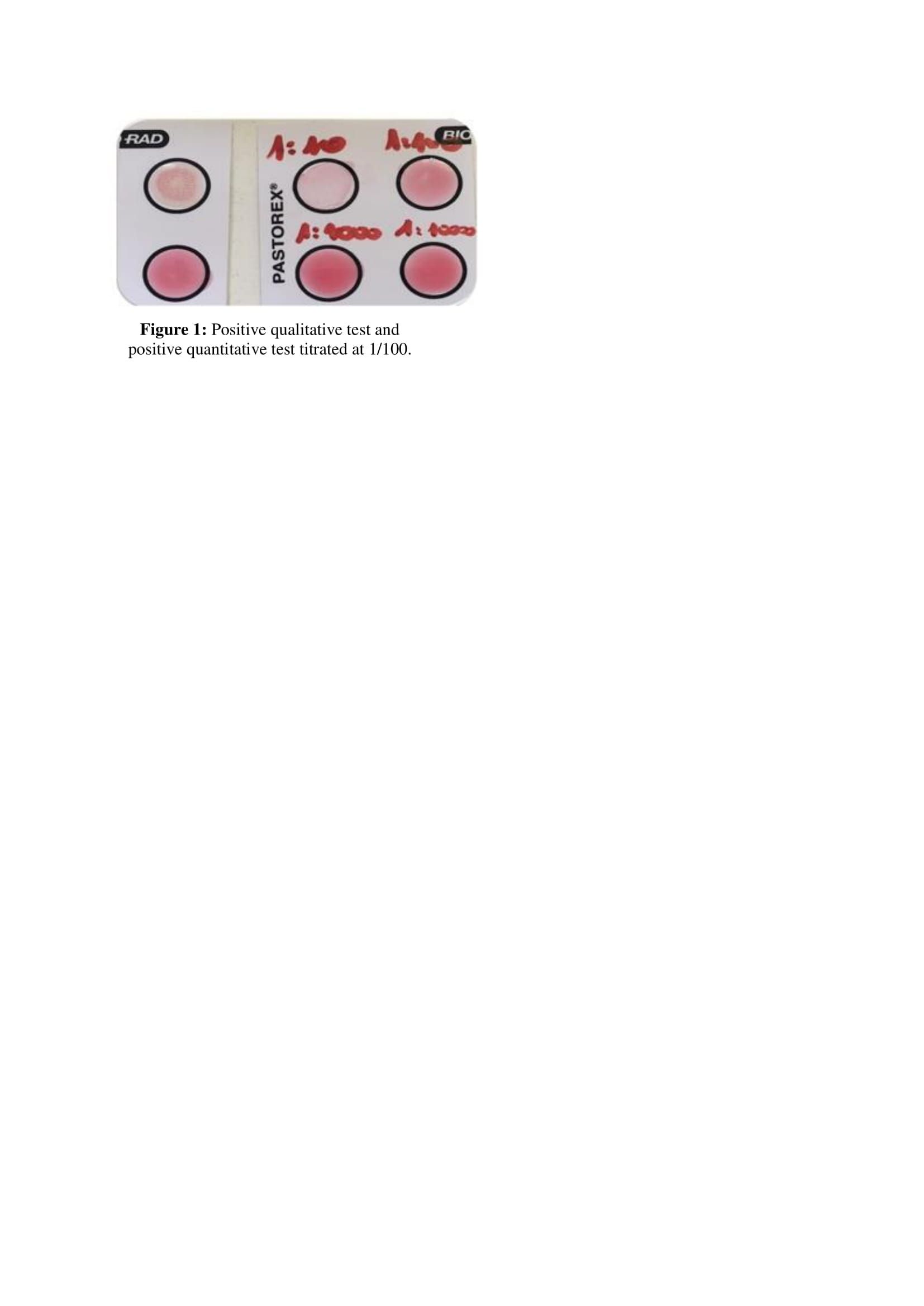 Serum and cerebrospinal fluid capsular polysaccharide antigen testing by latex agglutination was performed, with a positive qualitative test and a quantitative CSF test titrated at 1/100 (Figures 1 and 2). The brain scan noted the presence of deep lacunar lesions.