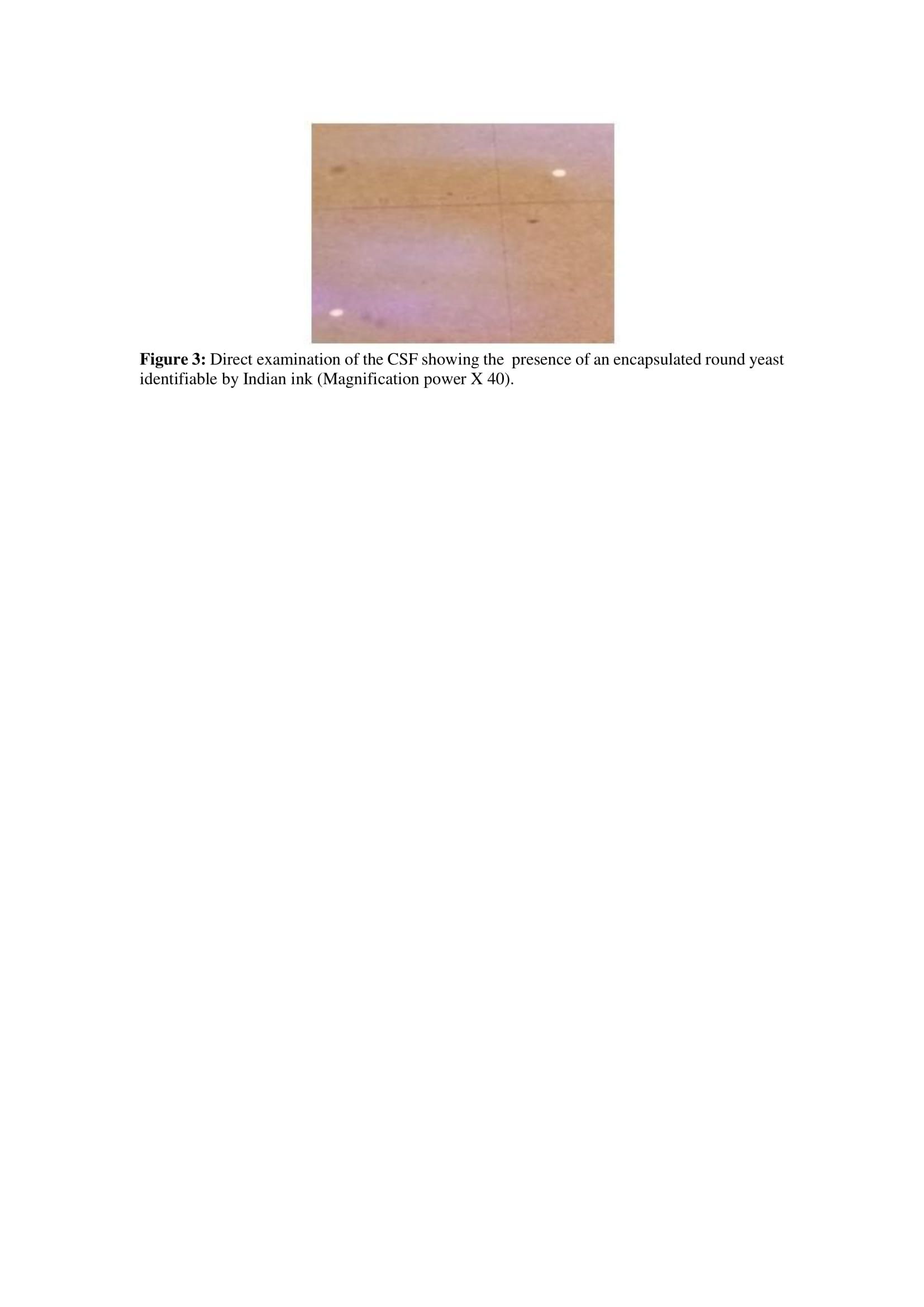 The mycological examination of the CSF found on direct examination with Indian ink the presence of encapsulated round yeasts with a peripheral halo, characteristic of Cryptococcus neoformans (Fig. 3). The detection of circulating cryptococcal antigens by latex agglutination in the CSF and serum was positive at a titre of 1/4096.
