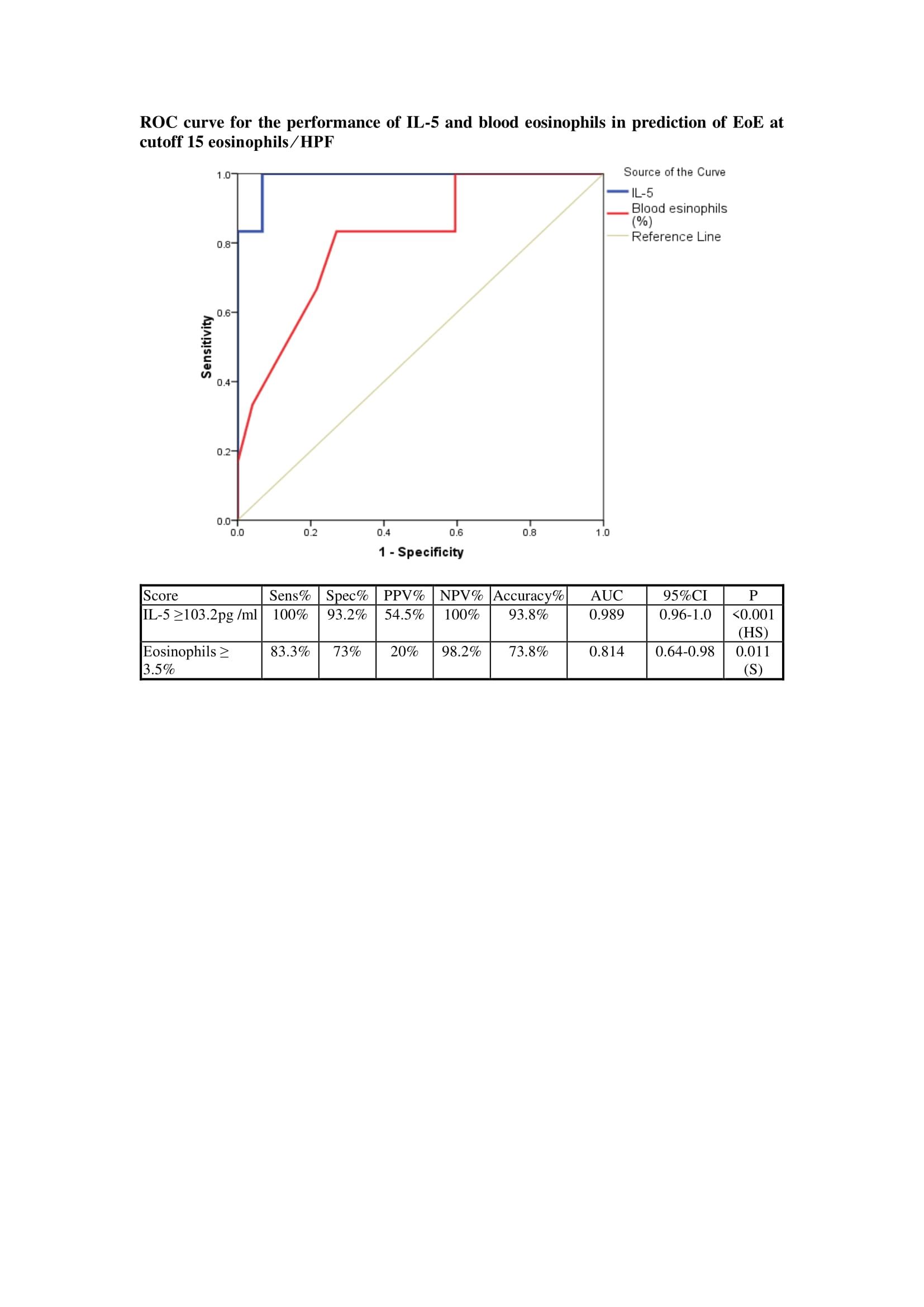 Based on the EoE histological diagnostic criteria, EoE patients were six and non EoE patients were 74. Regarding demographic data, the mean age of EoE patients was 36.3±18.8years, which was ~ 2 years younger than non-EoE esophagitis patients (mean age 38.1±13.3 years) and 32.5±14.7 in controls. Female gender [4 (66.7%)] were more common in patients with EoE, 46 (62.2 %)] in non-EoE patients and 6 (60%) in controls] (table 1). As regard symptomatology of the studied patients, heartburn [6 (100%)], dysphagia [5 (83.3%)], chronic epigastric pain [6 (100%)], persistent vomiting [4 (66.4%)] and history of food impaction [4 (66.4%)] were more common in EoE patients (table 2). By laboratory assessment of the studied subjects (peripheral eosinophilic count), all six eosinophilic esophagitis patients had increased peripheral eosinophilic count (2.3-7.0%) than non-EoE patients and controls with statistically significant difference (table 3 and 6). Regarding endoscopic features, esophageal furrows, fissures and/or wrinkles; white exudate, plaques and/ or granularity and fixed or transient concentric rings (trachealization)were more common in EoE (50vs5.4%), (83.3vs6.8%) and (83.2vs 9.5%) and respectively. While hiatus hernia and GERD were not statistically significant between EoE and non-EoE patients (table 4). Regarding histopathological examination of the studied subjects, mucosal and sub mucosal edema, basal hyperplasia, papillae elongation, squamous cell layer thinning and infiltration lymphocytic or neutrophilic were more frequent in EoE compared with non-EoE patients (83.3, 83.3, 83.3, 66.7 and 83.3% vs 28.4, 28.4, 35.1, 23and 26%) with significant statistically difference. While, goblet Cell metaplasia was demonstrated only in 7 patients of non-EoE (table 5). Regarding serum IL-5 assay by ELISA, median concentration of serum IL-5 in EoE patients was 222.2pg/ml with range 187.5-307pg/ml while, it was 32.1pg/ml with range 15.6-113.6pg/ml in non EoE patients and 11.8pg/ml with range 13.4-38.2pg/ml in controls with P value < 0.001. ROC curve analysis showed that IL-5 can significantly predict EoE at a cutoff value of ≥103.2pg /ml with 100% sensitivity, 93.2% specificity, 54.5% PPV, 100% NPV, 93.8% Accuracy, AUC = 0.989 and (95%CI) = 0.96-1.0. ROC curve analysis showed that eosinophils can significantly predict EoE at a cutoff value of ≥3.5% with 83.3% sensitivity, 73% specificity, 20% PPV, 98.2% NPV, 73.8% Accuracy, AUC = 0.814 and (95%CI) =0.64-0.98.