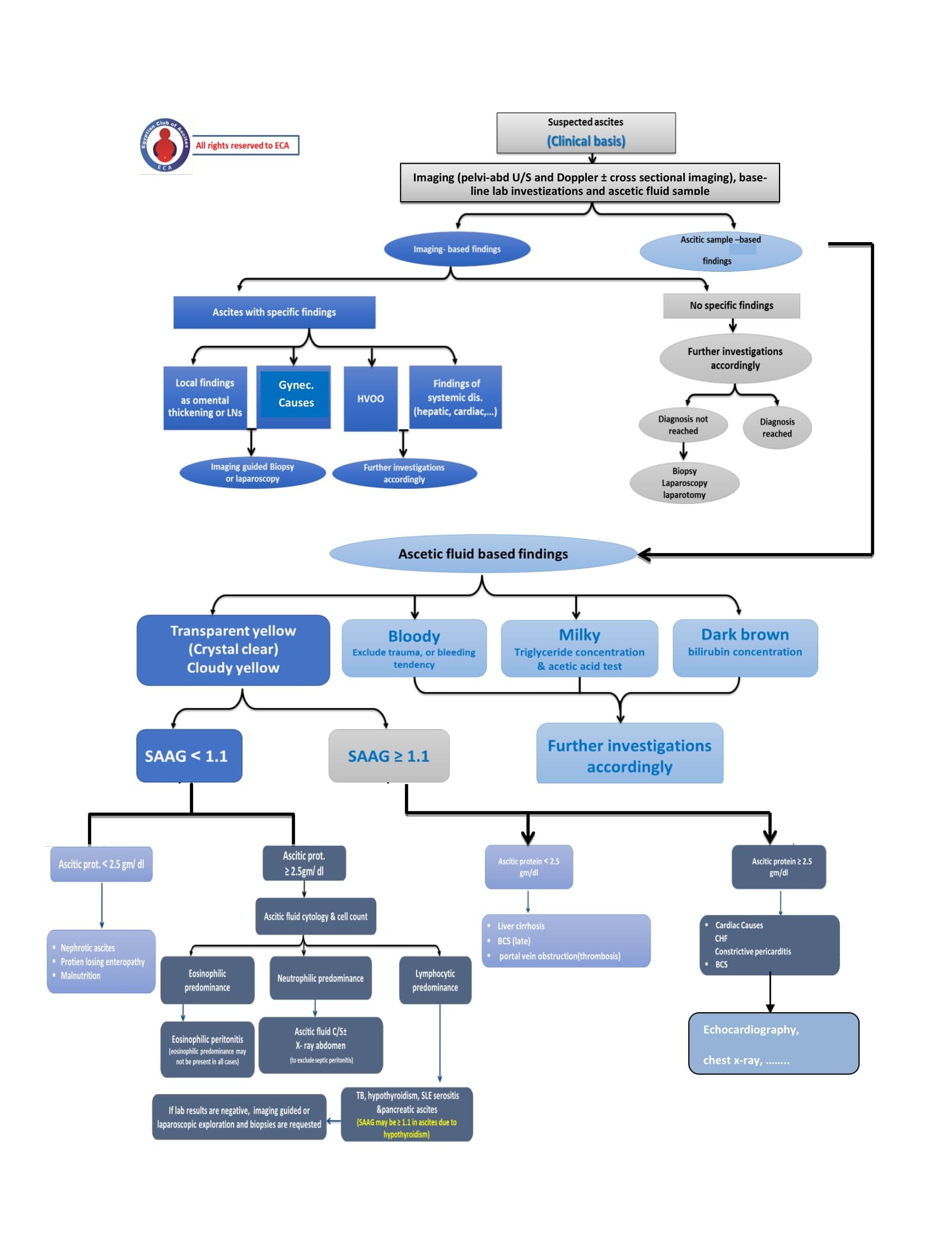 A consensus on the diagnostic workup of adult patients with ascites was developed by the ECA hoping that it would enable for a judicious use of investigational methods in this field. We just suggest an approach to diagnosis of ascites based on our expert opinions from different Egyptian universities according to availability, finance and effectiveness of different tools to reach the diagnosis in our centers. We have already used this algorithm in our university hospitals (Cairo, Ain Shams, Alazhar, Assuit, Minia , Zagazik, Benha,..) With great success. (ECA algorithm attached).