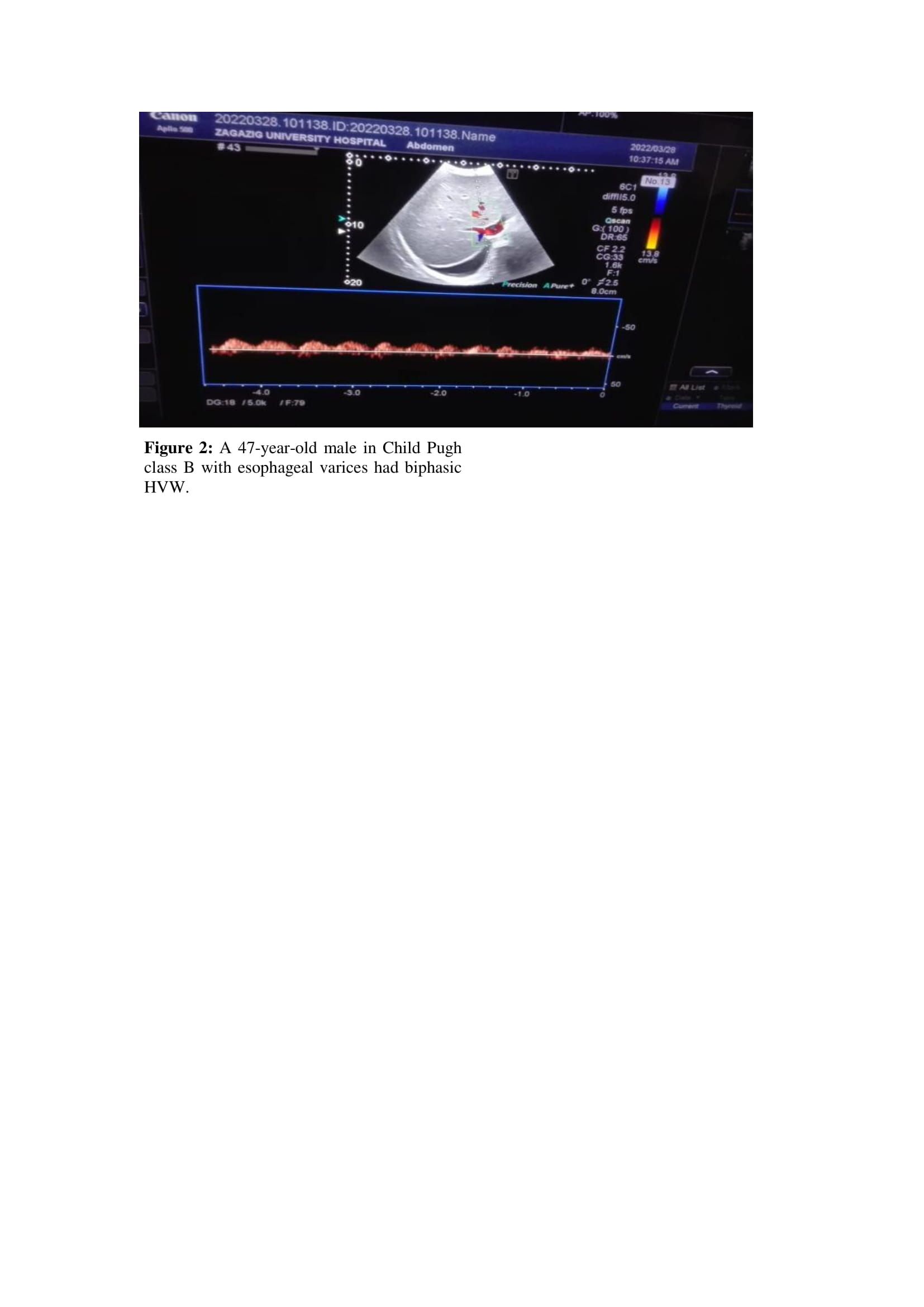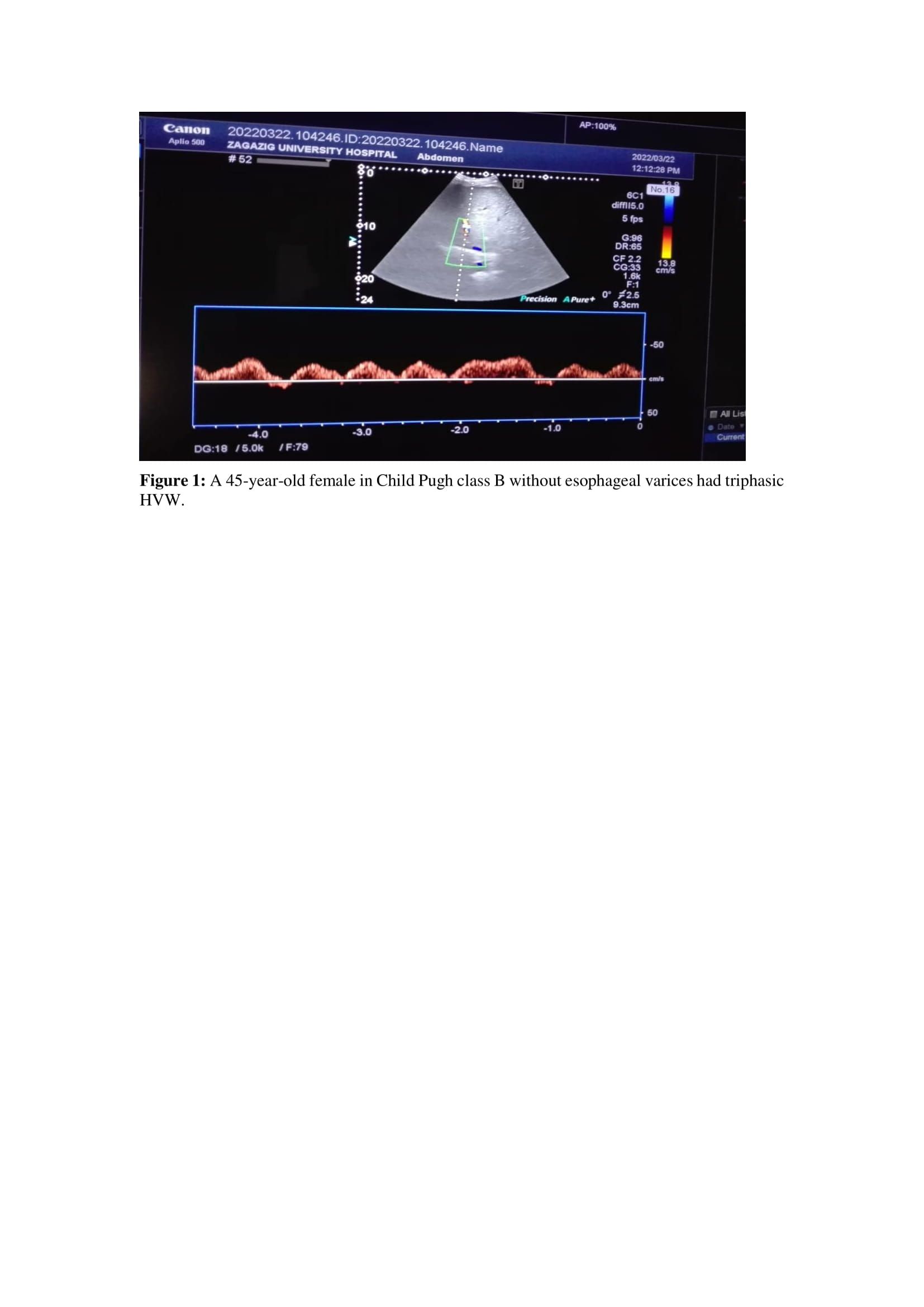 Colored Doppler ultrasound for assessment of hepatic vein waveform and calculation of damping index. Doppler ultrasonography were assessed with an ultrasound sonography device (Canon applio I 500 tm Japan and with 3.5 Mhz curvilinear probe) via the right intercostal or subcostal method. Only one operator evaluated all patients to minimize the inter-operators variations.