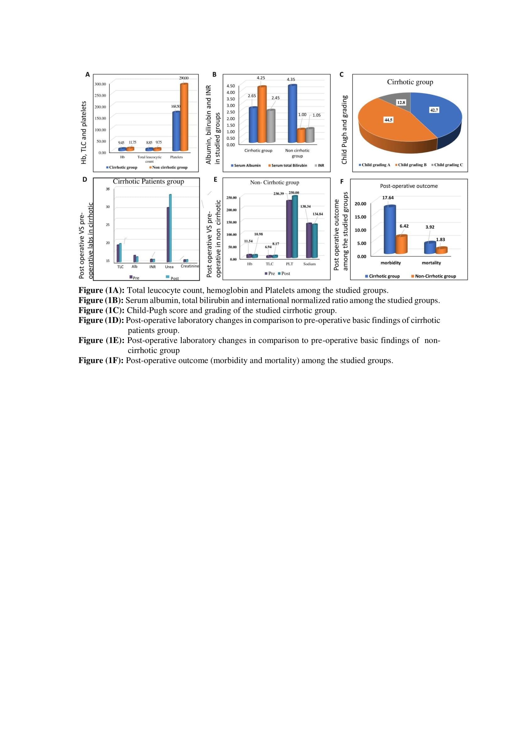 According to Table 4, the mean values of TLC, blood urea, and serum creatinine significantly increased in the cirrhotic group while the mean values of serum albumin, INR, and Na significantly decreased post-operatively compared to their pre-operative levels. In non-cirrhotic patients, there was significant increase in mean values of TLC and platelets count with significant decrease in mean values of Hb concentrations and serum Na post-operative compared to pre-operative values, however, no significant changes were noted regarding liver functions (figures 1D and 1E).