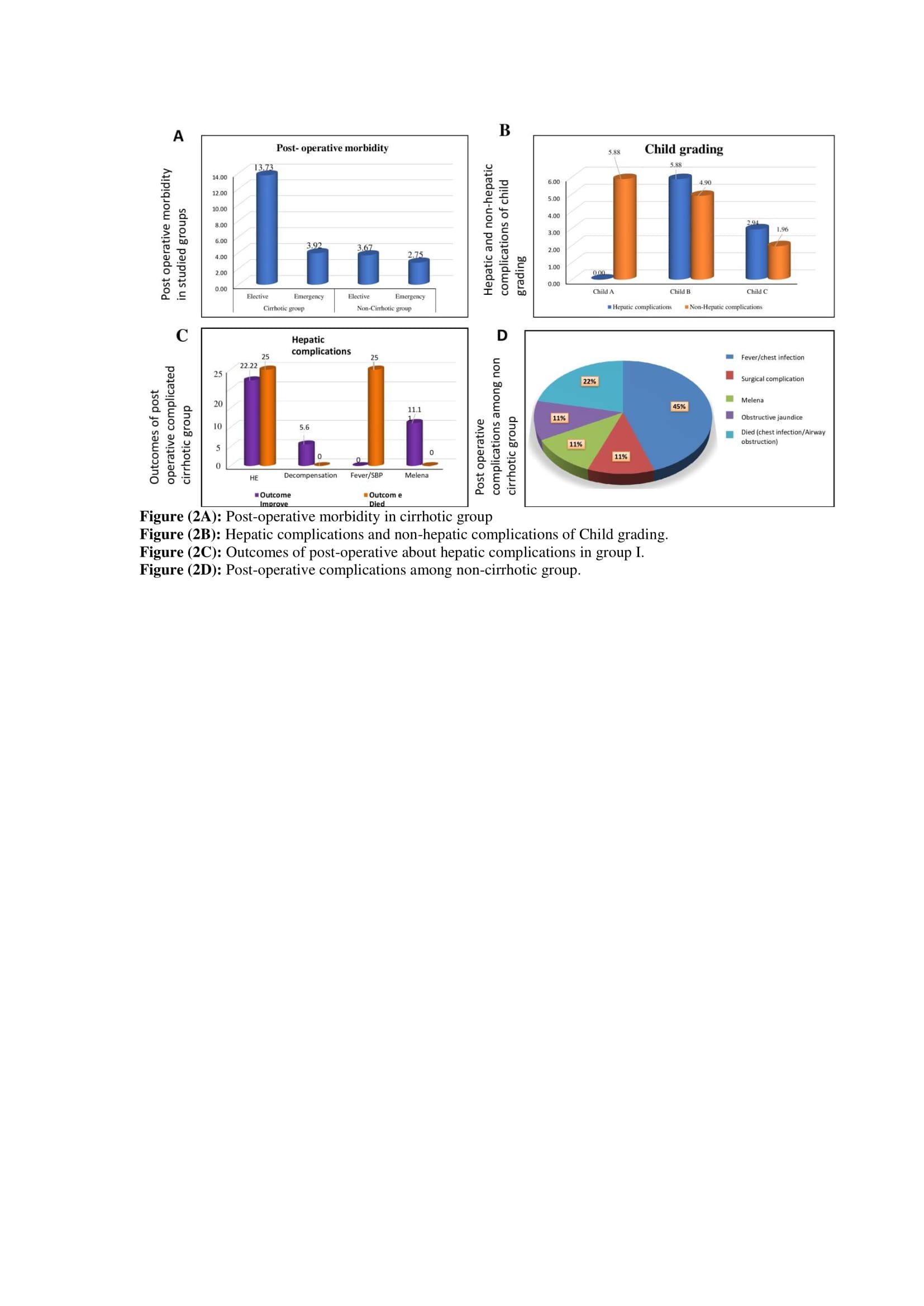 Concerning the post-operative health problems in the cirrhotic group, there was a significant difference between patients who underwent elective and emergency procedures, with elective procedures experiencing more frequent complications either hepatic or non-hepatic and only emergency procedures experiencing post-operative mortality. Hepatic complications including HE, decompensation, SBP, and melena were more frequent in patients with Child Pugh grade B and C than those with grade A. In non-cirrhotic patients, there was a statistically non-significant difference between elective and emergency operations regarding post-operative morbidity, but only emergency operations were associated with post-operative mortality (figures 2A-D).