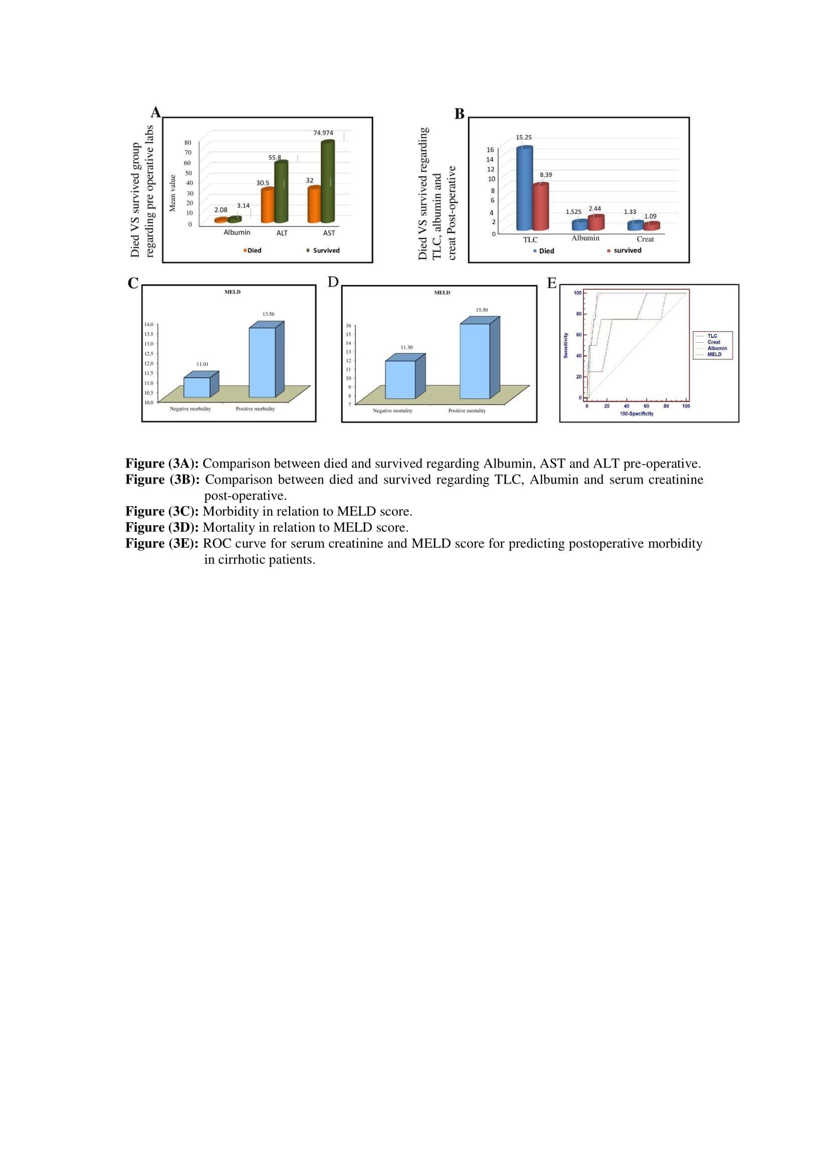 Preoperative data from the cirrhotic group were compared between survived and dead patients. We found that the dead patients significantly had higher total leucocyte count, serum creatinine, and MELD score (p 0.001, 0.049, and 0.002, respectively), as well as lower serum albumin (p = 0.028) as illustrated in table 5 and figures 2A-D. Additionally, the ROC curve was applied to identify the sensitivity of each in predicting operative outcome. AUC for total leucocyte count, serum creatinine, MELD score and serum albumin was 0.958, 0.759, 0.963, and 0.765 respectively at cut off >11.5, >1.2, ≤2.3, and >15 respectively (table 6 and figure 3E).
