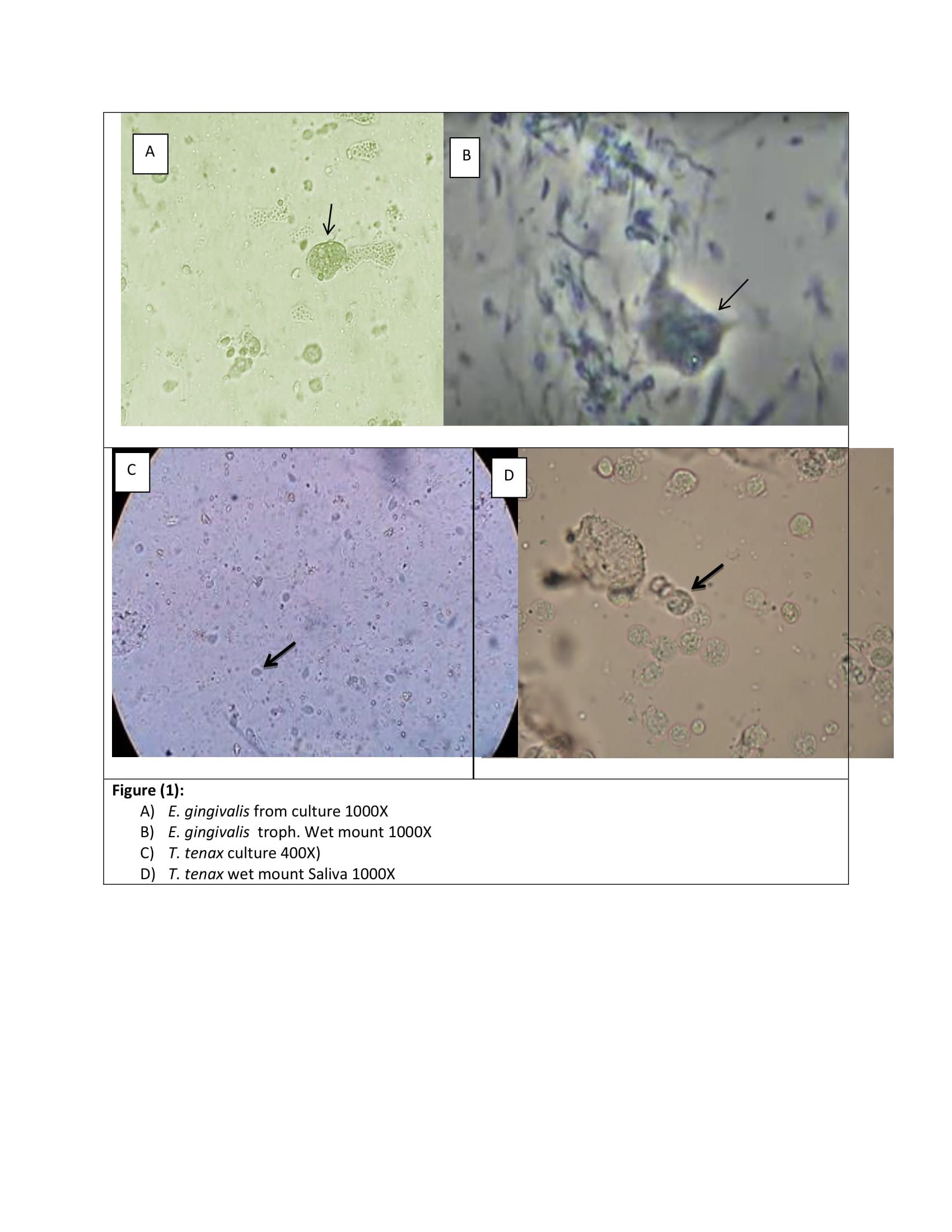 Table (3)compares wet mount and culture in detection of oral protozoa, wet mount microscopy detected 38.5% of E. gingivalis and 31% of T. tenax cases compared to 62.5% and 53% for culture. In addition, when taking culture as a confirmatory test, the wet mount had a sensitivity of only 58.5% - 61.6% and 100% specificity. Figure (1) shows some of the detected organisms during examinations.