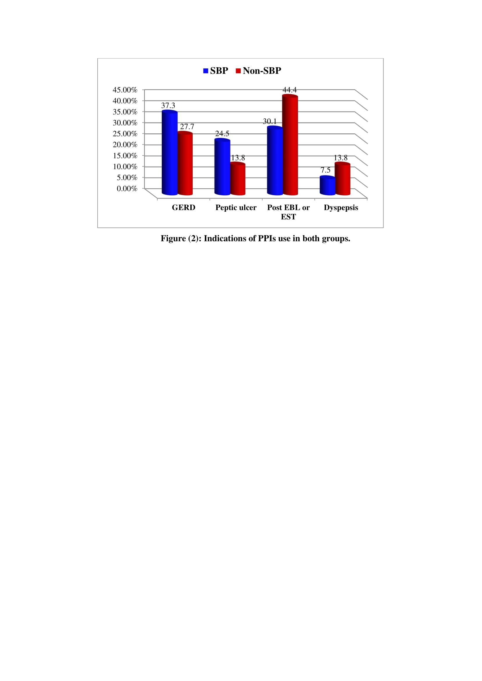 The current study also examined the indications of PPIs use. The indications for PPIs use in this study were limited to GRED, peptic ulcer disease, post esophageal band ligation or sclerotherapy (Post EBL or EST) and dyspepsia. There was no statistical significant difference between SBP and non-SBP patients as regards indications of use (P >0.05). In-contrast, Bajaj etal. and Goel etal. reported that cirrhotic patients with SBP have no documented indication for PPIs therapy in 47% and 68% respectively [20,8]. Furthermore, results from another study by Ratelle et al. [22] showed that about 35% of patients in both SBP cases and control groups had no documented indication for PPIs use which point at PPIs overuse in cirrhotic patients as in previous studies [32,33]. This was the rationale to run studies to evaluate the health benefits of depriving decompensated cirrhotic patients from non-indicated use of PPIs [34].