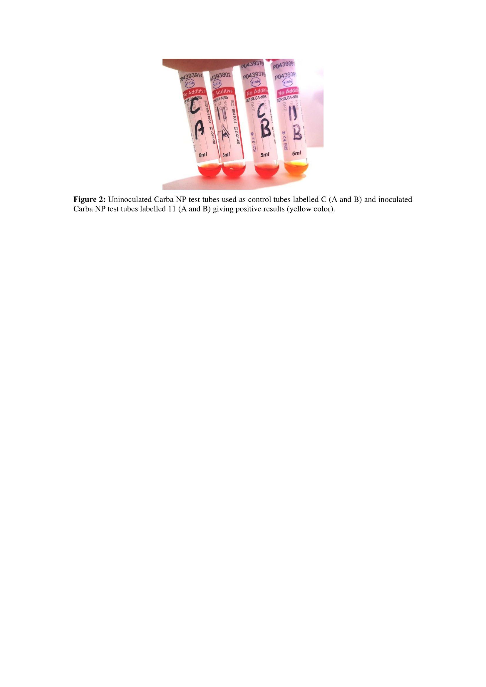 A quick chromogenic test was developed for detecting carba-penemases called Carba NP. This test depends on carbapenemases' ability to break the beta-lactam ring of imipenem, yielding an acid which can be identified by the shift of phenol red color from red to yellow or orange. For detecting carbapenemases in Enterobacteriaceae, it exhibited 100% sensitivity and specificity. In Pseudomonas, the results were 94.4 and 100%, respectively [7].