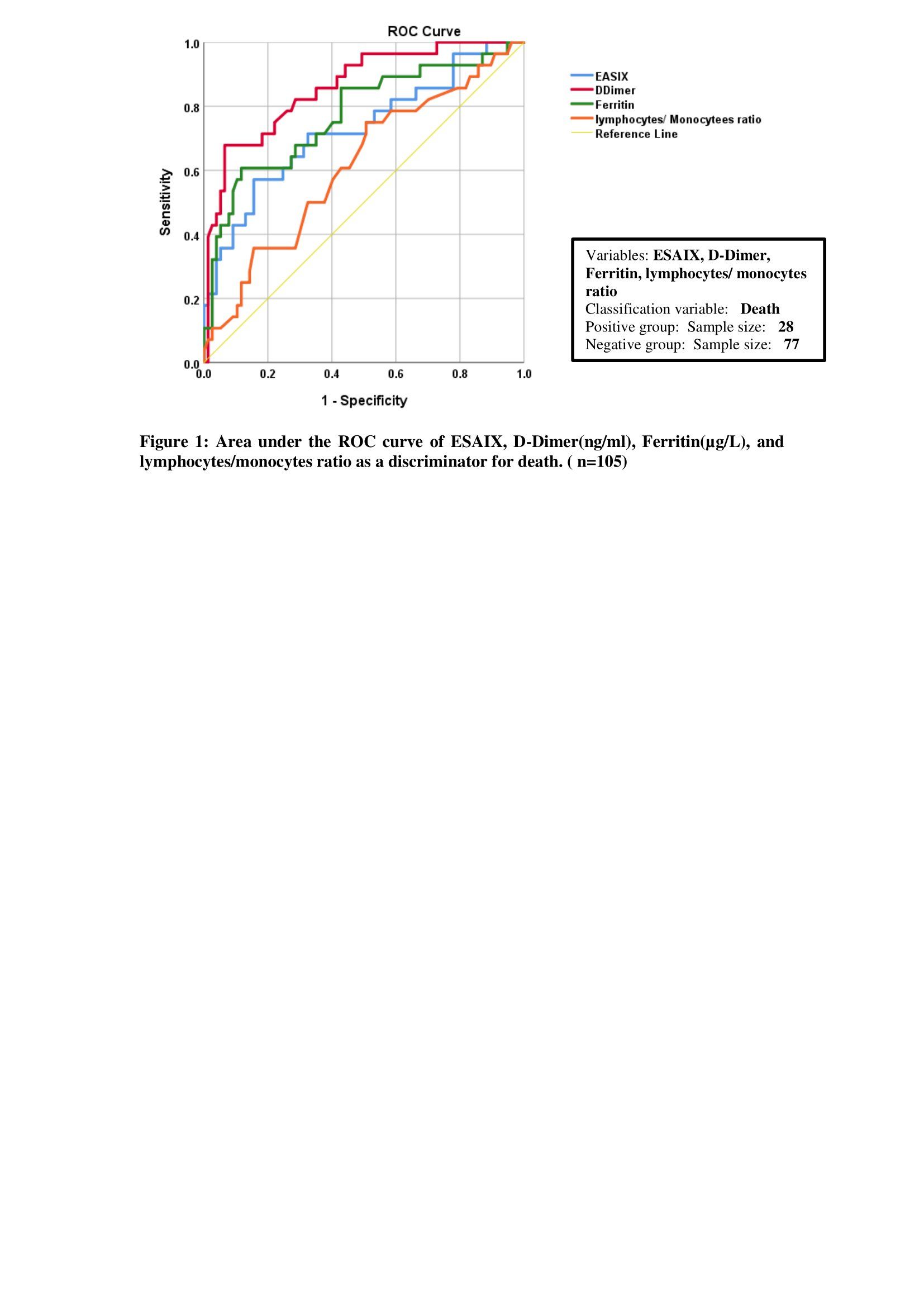 By discussing our results as regards D-Dimer, ferritin, EASIX, and LMR as a prognostic determinant of mortality and ICU admission, we found that they were a delicate parameter as they showed a statistically significant sensitivity and specificity. But need for mechanical ventilation was more correlated with D-Dimer, ferritin and EASIX as LMR was statically insignificant. Elkhalifa [23] results were in consistence with our findings as he stated that D-dimer mean values were considerably higher in COVID-19 patients who died and in ICU patients. He suggested that this biomarker may be useful as a predictor and prognostic indicator of severity, especially for COVID-19 patients who end up in the ICU.