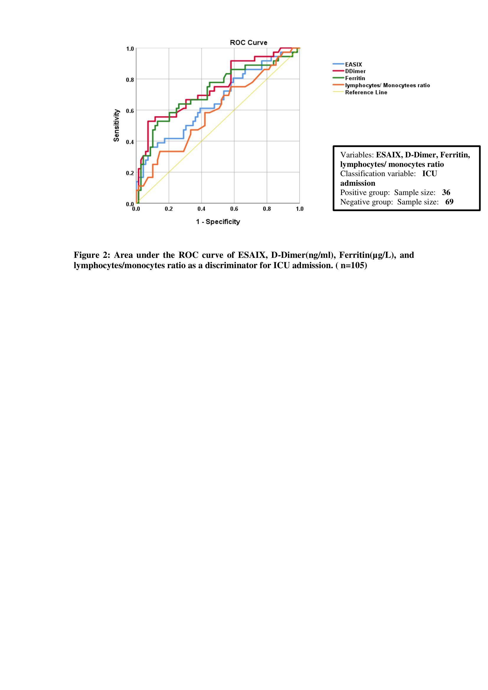 By studying the same four parameters as regards ICU admission in COVID-19 patients we found that all of them had significant sensitivity and specificity (p=0.01,0.00,0.00, and 0.033; respectively). Table 6, Figure 2. D-Dimer had the highest overall accuracy of 74 (AUC= 0.744), followed by ferritin 72 % (AUC=0.719), EASIX 65% (AUC=0.653, and the lowest accuracy appear in LMR 60% (AUC=0.595).