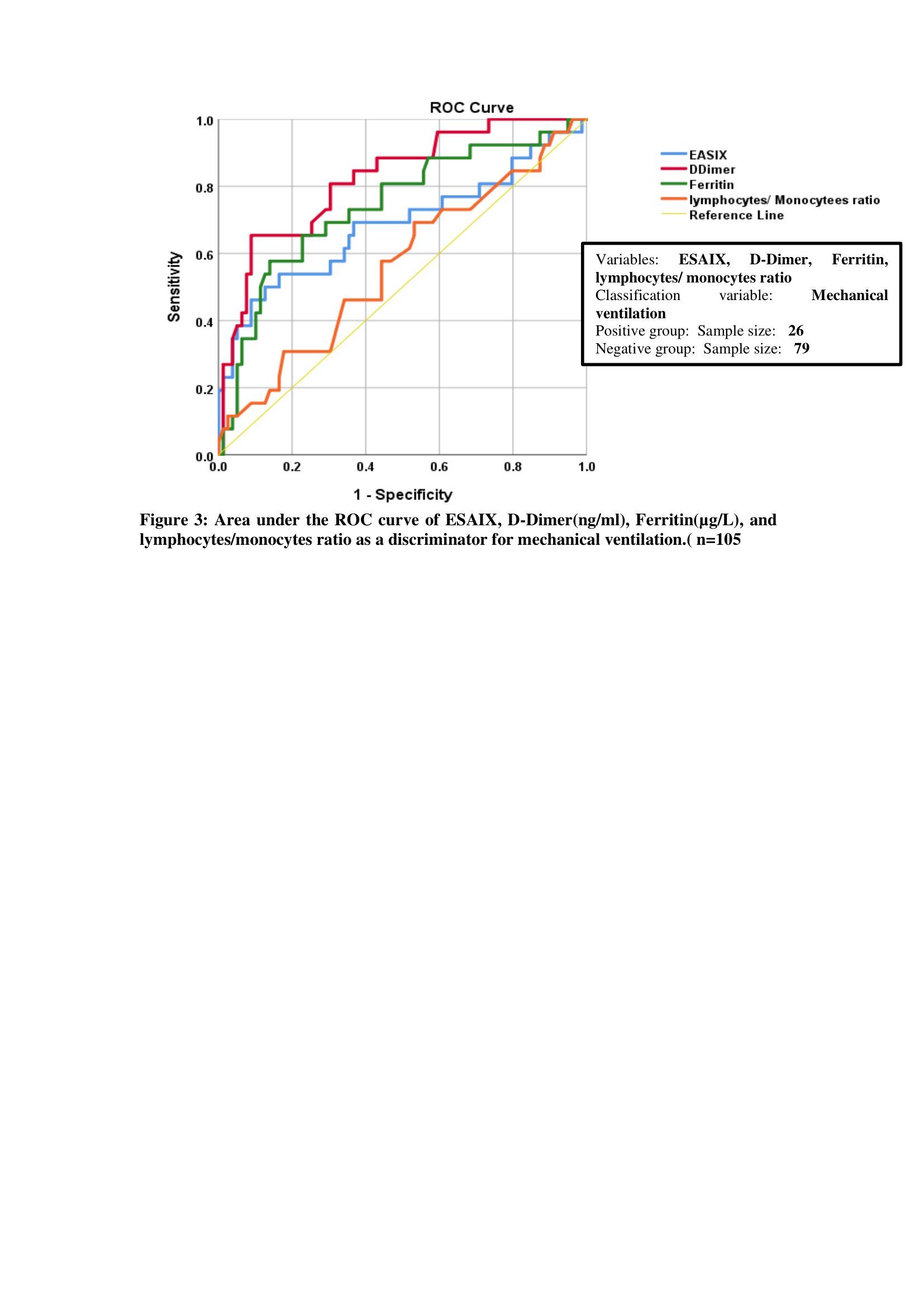 When the previous four parameters were analysed by measuring their sensitivity and specificity as predictors for requirement of mechanical ventilation in our patients, we found that D-Dimer, ferritin, and EASIX were statically significant with p value of 0.005, 0.00, and 0.00; respectively with over all accuracy of 82 % for D-Dimer, 74 % for ferritin and 69% for EASIX; while LMR didn’t show any statistically significant sensitivity nor specificity. (Table 7, Figure 3).