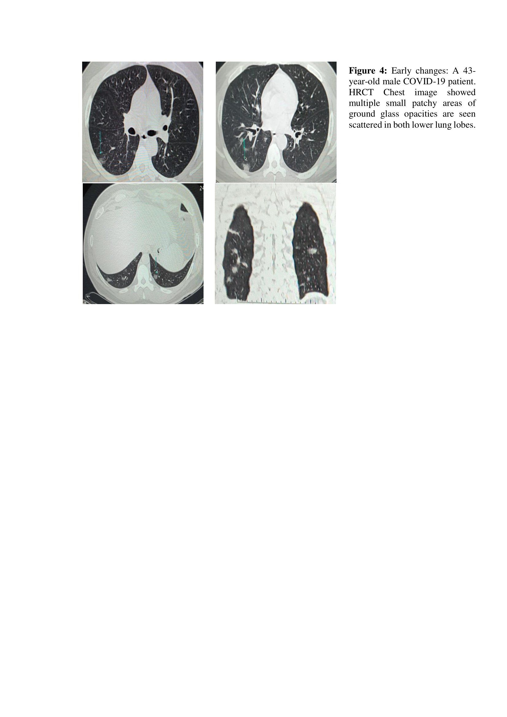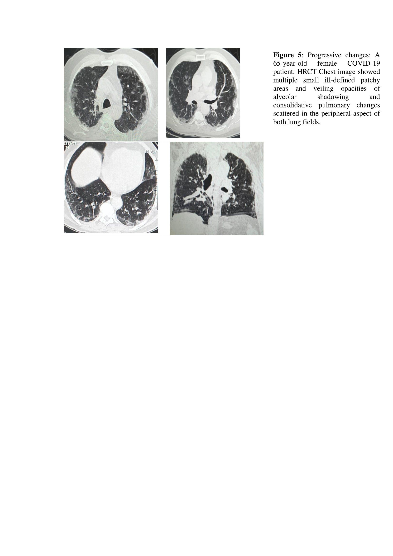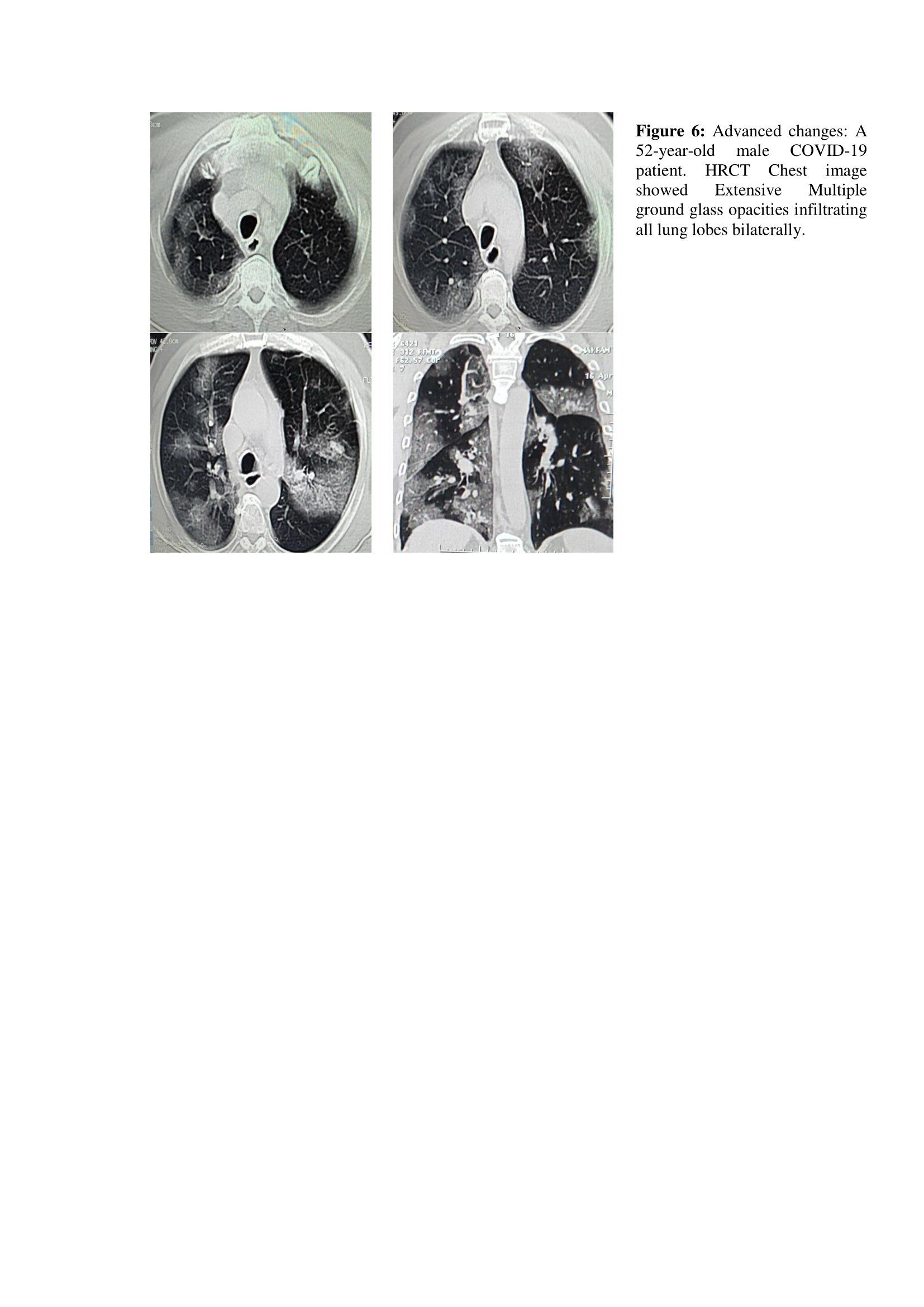 Table (8&9) showed the detailed analysis of chest CT imaging;39 patients (37.14%) were classified as early stage (Figure 4) from them 16 patients had ground glass opacity (GGO), 8 patients had patchy consolidation while 15 patients had mixed of GGO and consolidation. Progression stage were detected in 54 patients (Figure 5), from them 8 (14.81%) patients had GGO, 15 (27.77%) patients had patchy consolidation and 31 (57.40%) patients had mixed of GGO and consolidation. The last 12 (11.42%) patients were classified as advanced stage (Figure 6) from them 4 (33.33%) patients had patchy consolidation and 8 (66.66%) had mixed of GGO and consolidation.
